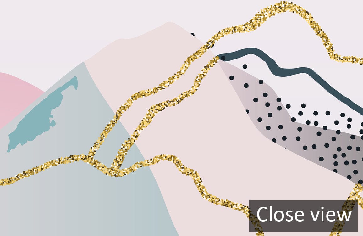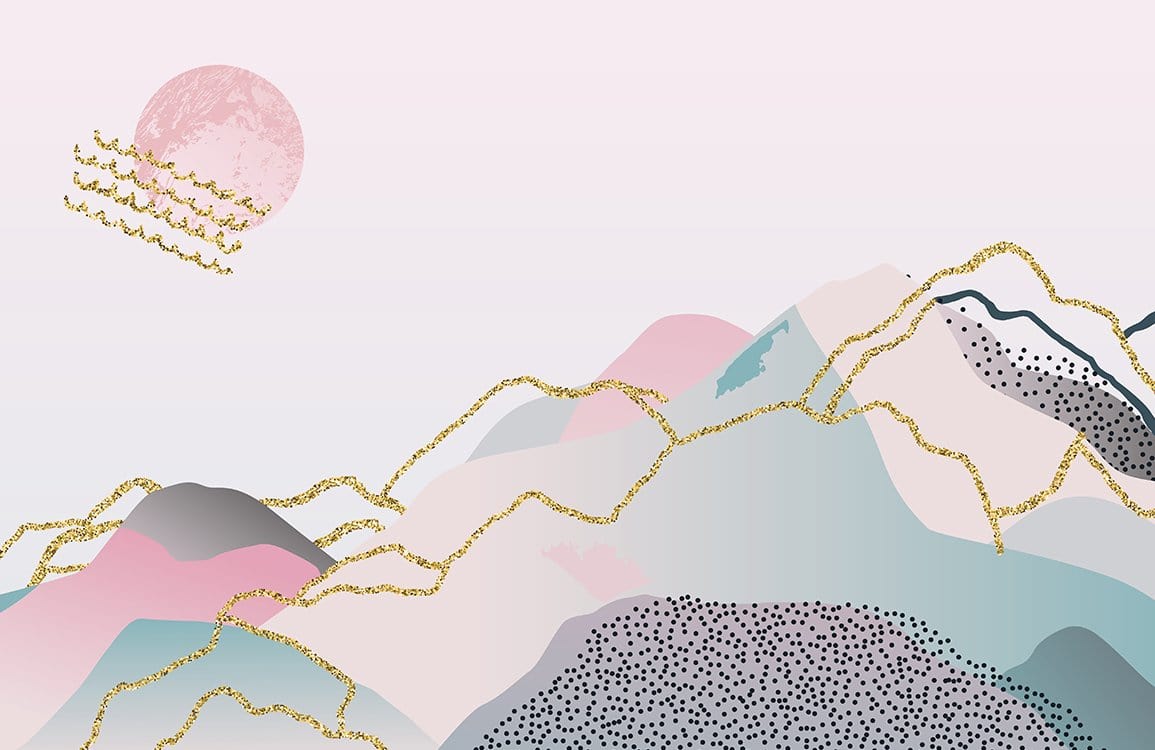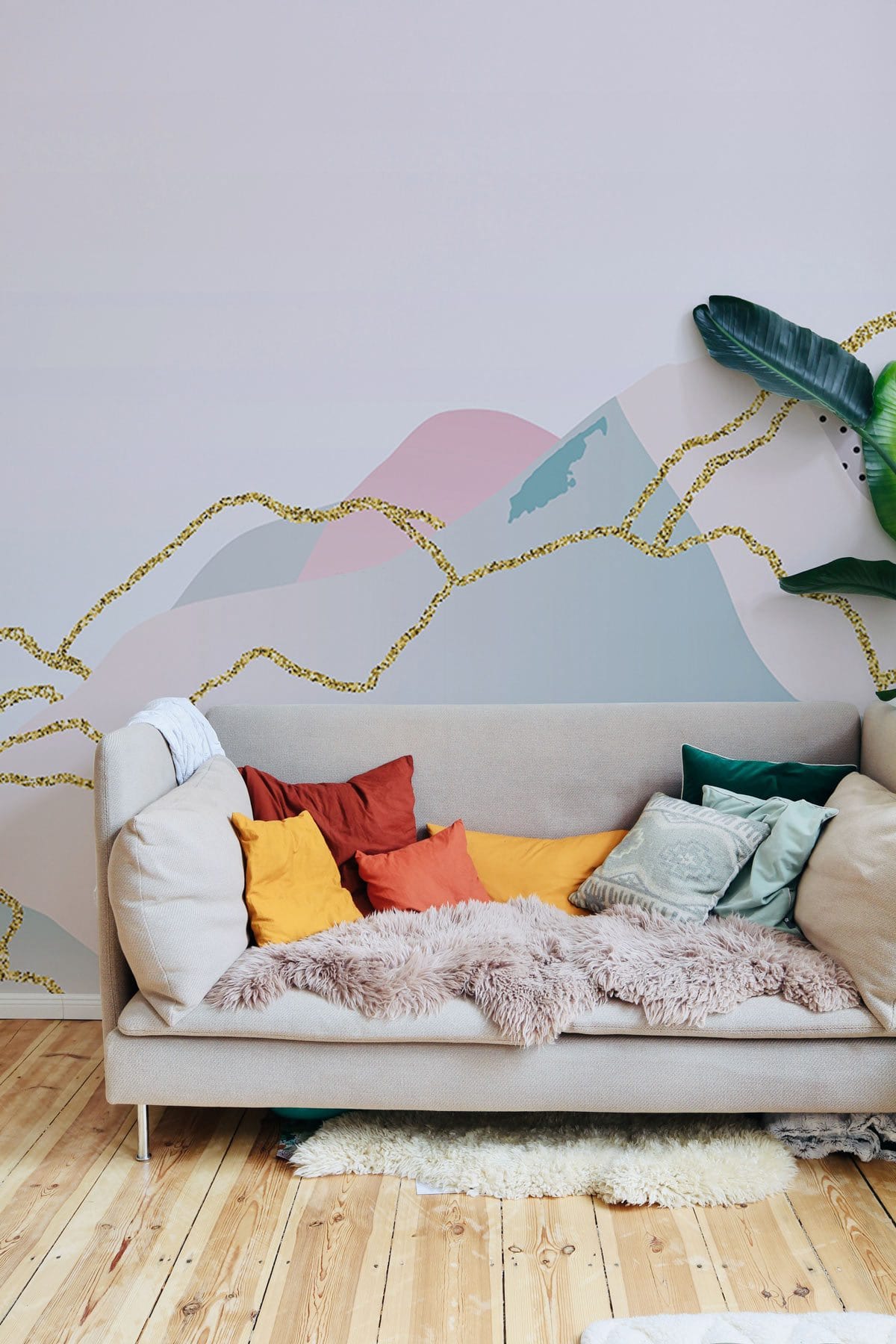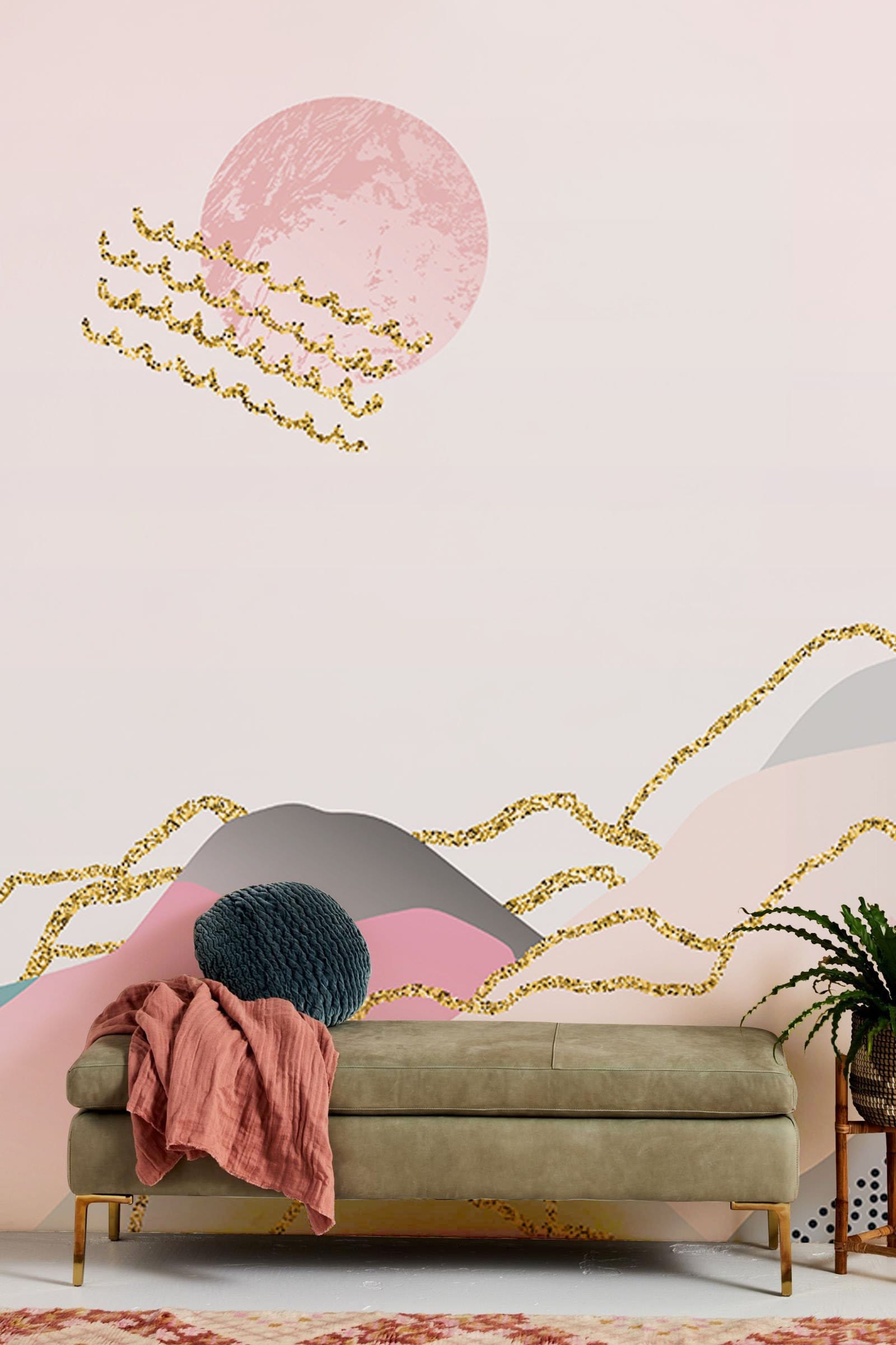 Breathe life into your space with the Dreamy Ombre Mountain Wallpaper Mural. Its elegant design captures soft mountain silhouettes gently melting into each other, framed by delicate pink and azure tones. Golden accents run like threads of light through the tranquil landscape, creating an artwork that blends serenity with refinement. Perfect for rooms seeking a splash of sophistication, this timeless mural adapts seamlessly to a myriad of interiors, offering both visual intrigue and a calming ambience.