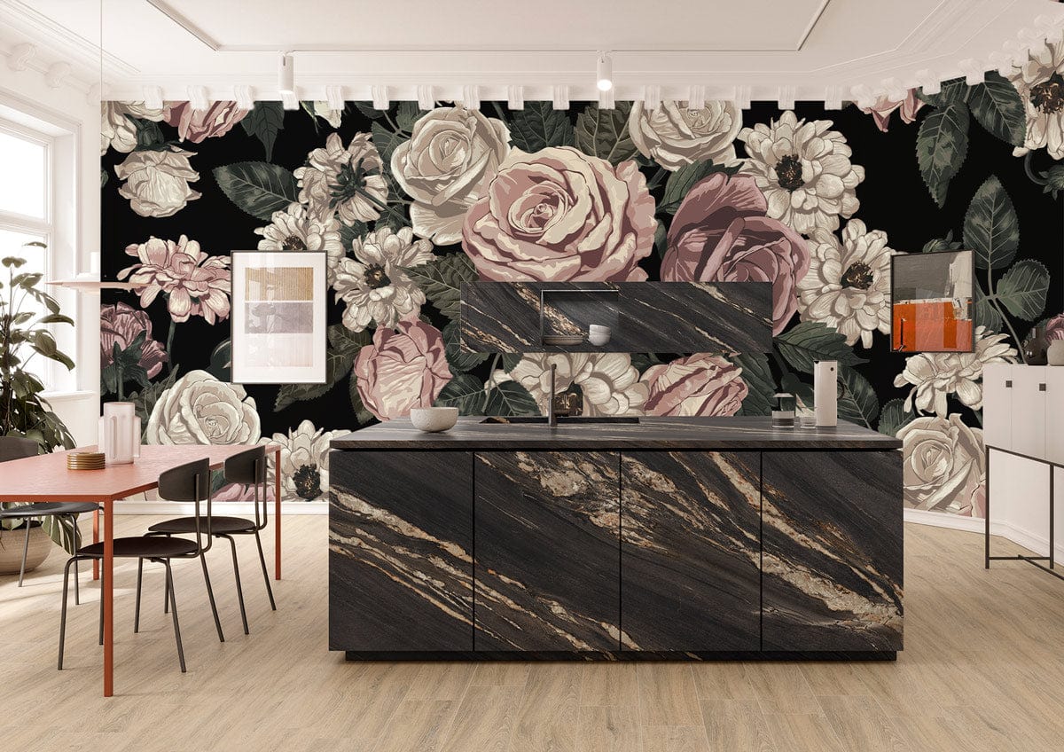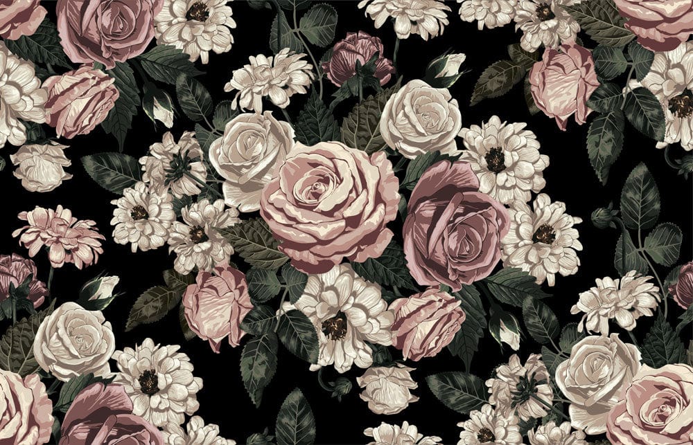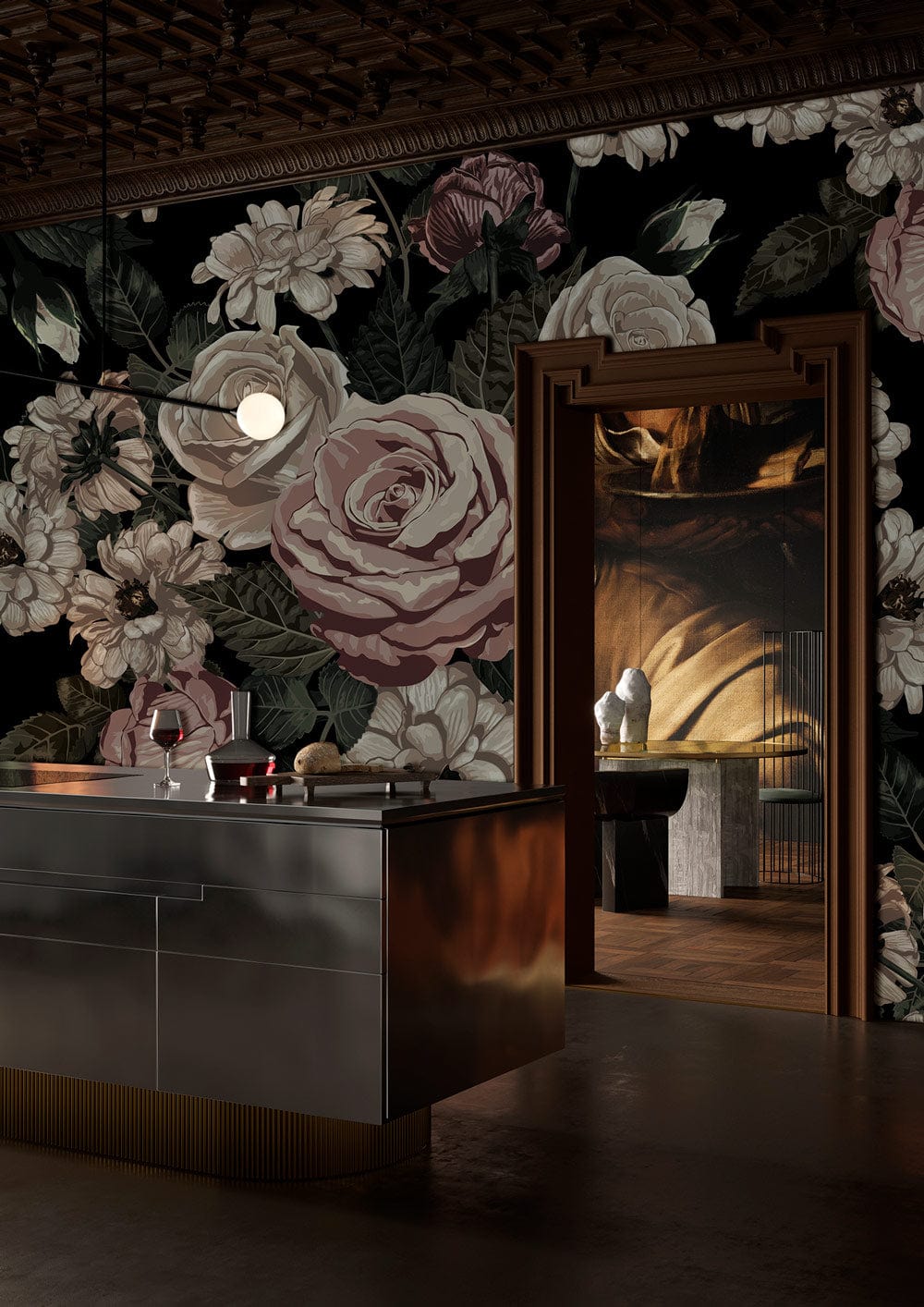 Opulent Floral Harmony Mural Wallpaper presents a lush tapestry of elegantly arranged roses and daisies, weaving together rich shades of plum and cream against a sophisticated black backdrop. This exquisite mural captures the timeless beauty of floral artistry, offering a sense of refined luxury suitable for classic and contemporary interiors alike. With its intricate details and captivating palette, it evokes a serene and inviting ambience.