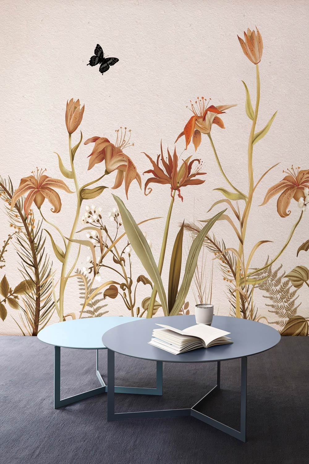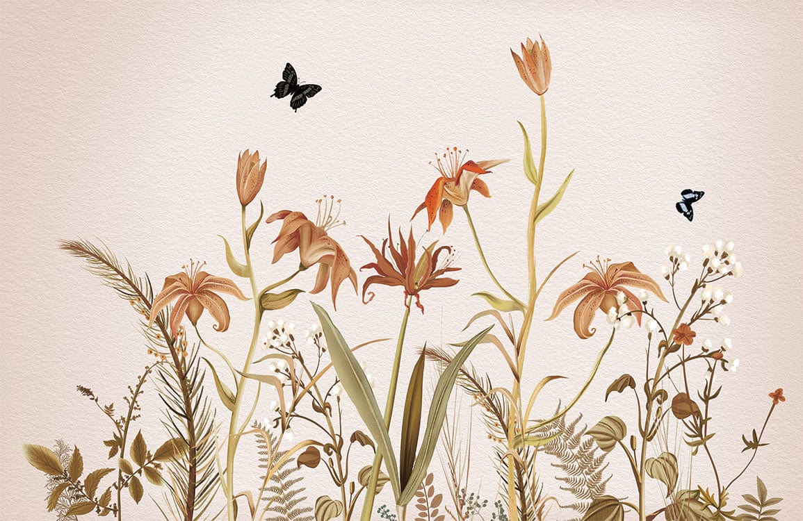 Immerse yourself in the serene beauty of the Orange Flower Bushes Wallpaper Mural. This exquisite design captures the essence of a tranquil garden, featuring intricate orange blossoms and delicate butterflies. The natural palette evokes warmth and elegance, gracefully fitting into both contemporary and traditional interiors.