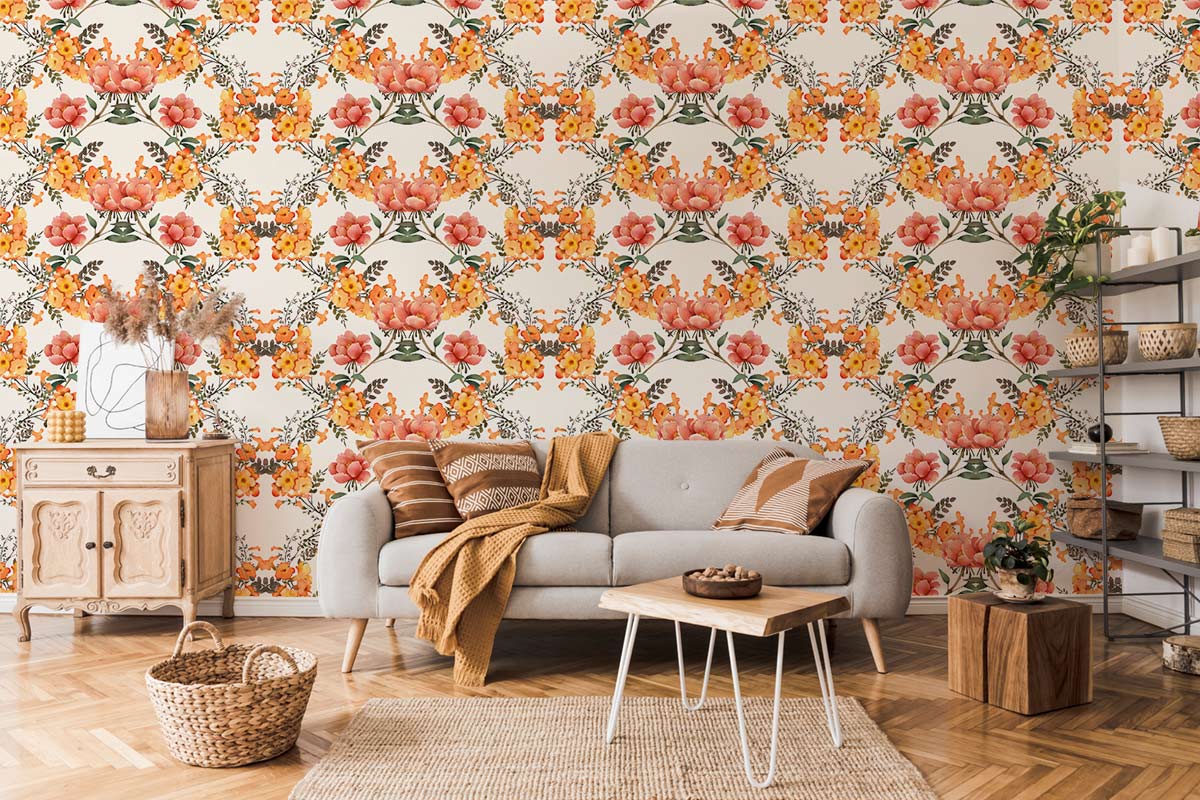 Immerse your space in the harmonious beauty of our Orange Flower Wreath Wallpaper Mural, featuring intricate floral patterns that evoke a sense of natural grace. The artistically arranged blossoms create a rich tapestry of visual interest, ideal for those seeking sophistication and a timeless ambience. This mural serves as a stunning backdrop, inviting warmth and charm into any room it graces.