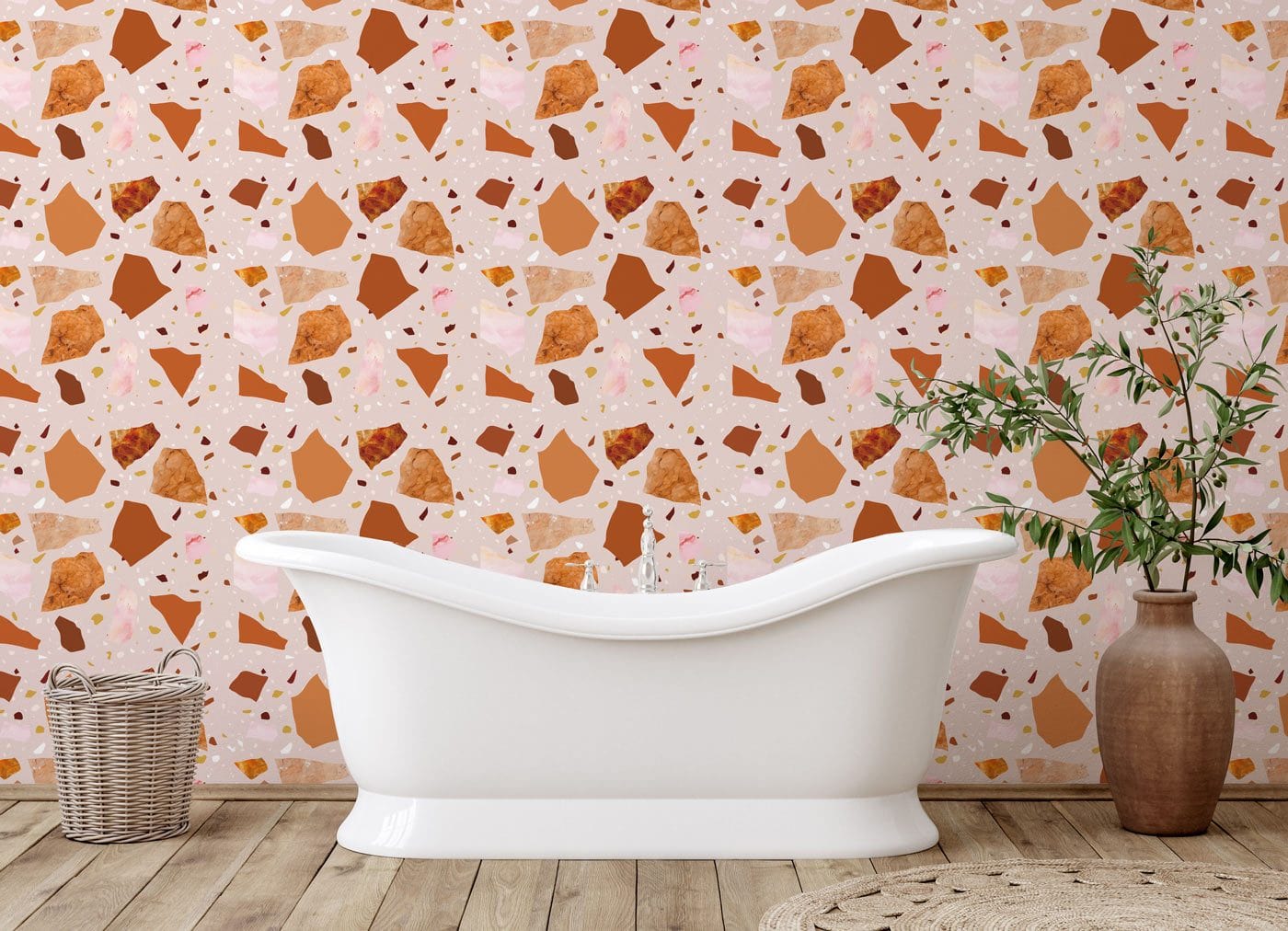 Get the simple look of orange terrazzo tiles on your walls with this gorgeous pastel wallpaper mural. This on-trend orange terrazzo wallpaper will create a soothing effect and add simple grace to your living room, bedroom, dining room, bathroom and children's room. Ideal wall mural that works perfectly with any furniture styles.
