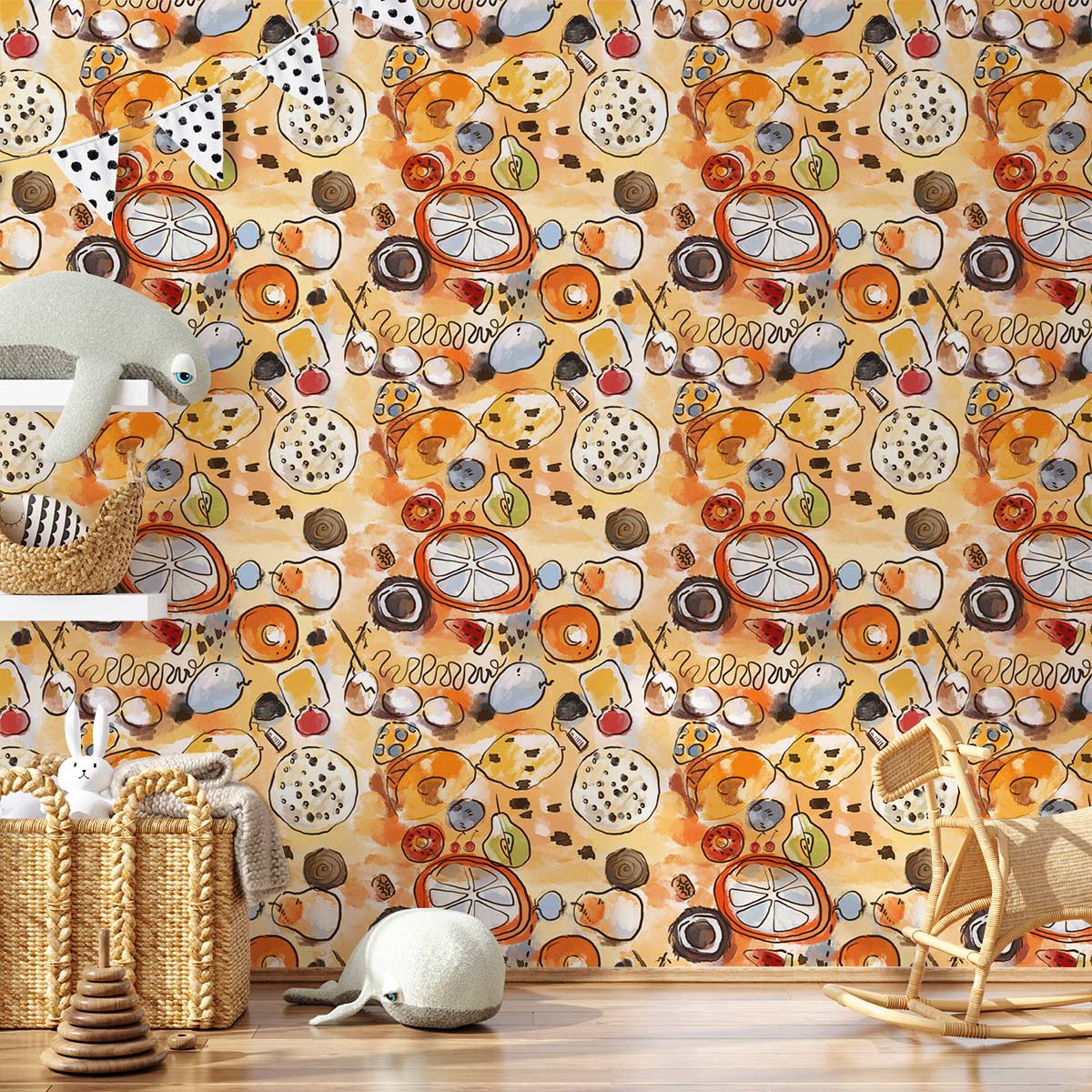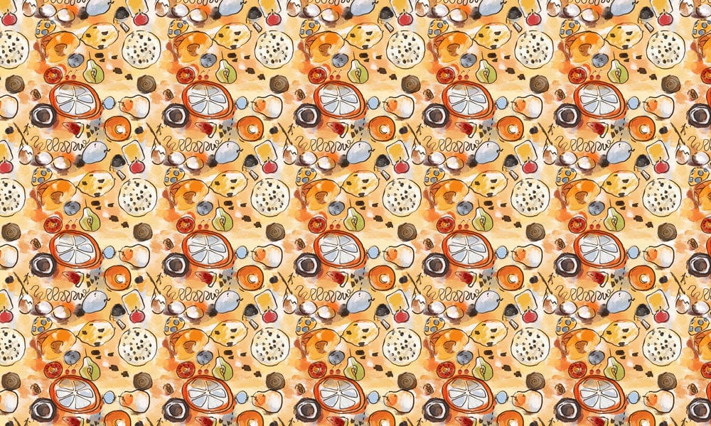 Our Orange Water colour Fruits Wallpaper Mural brings a burst of colour and warmth to your kitchen. Our unique kitchen wallpaper murals feature a orange water colour design with pears, pizza, donuts, apples, and more, inspired by the explosion of colourful food and fresh greens. You can instantly add a splash of style and colour to your walls with this food and drink wallpaper design!