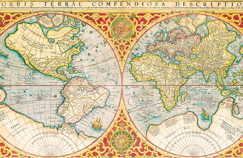 Orbis Terrae Descriptio Wallpaper Mural presents an exquisite cartographic design, capturing the allure of ancient maps with intricate detailing. Its rich historical aesthetic is complemented by vibrant hues that enliven any space, offering a refined, timeless charm. The depiction of continents, adorned with elegant Renaissance motifs, creates a focal point that invites exploration and intrigue, making it a distinguished addition to both contemporary and classic interiors.