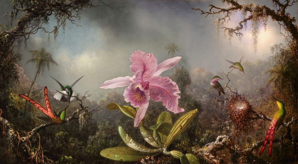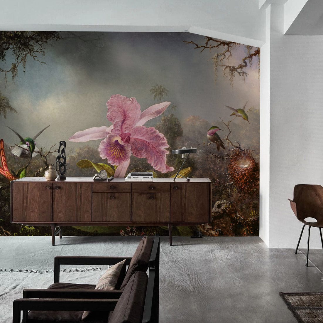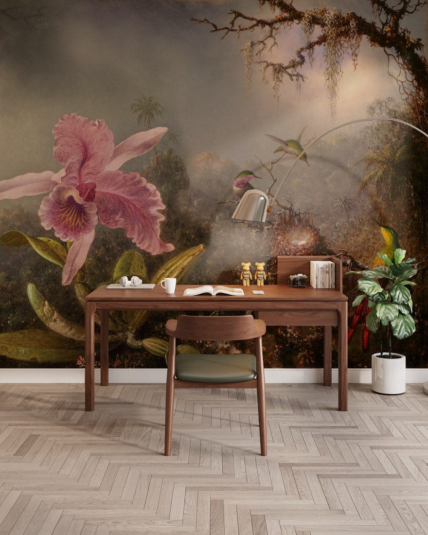 The Orchid Harmony Haven Mural Wallpaper invites you into an enchanting rainforest tableau, where a majestic orchid blooms amidst lively hummingbirds and lush foliage. Each detail is meticulously illustrated, capturing the vibrant energy and serenity of nature. This mural offers a sophisticated touch to any space, making it a captivating addition to both modern and traditional interiors.