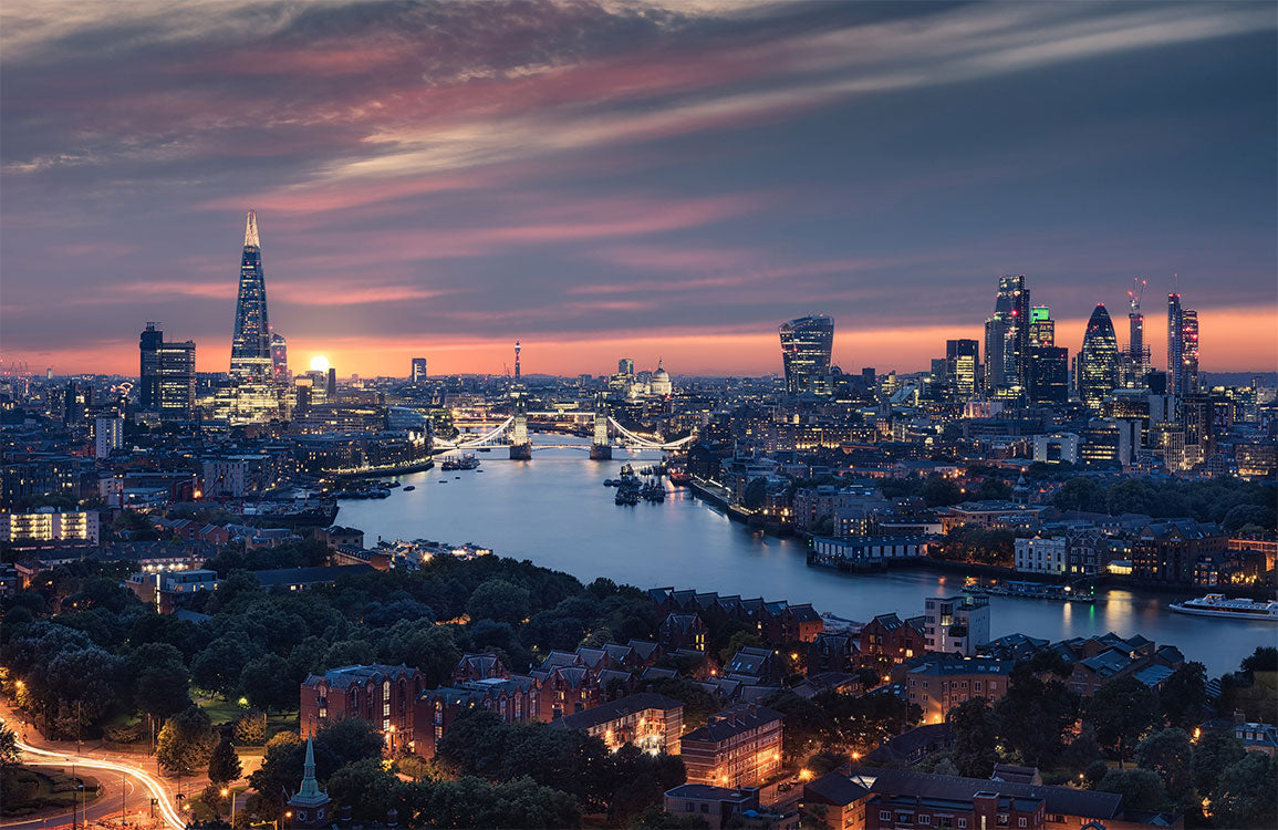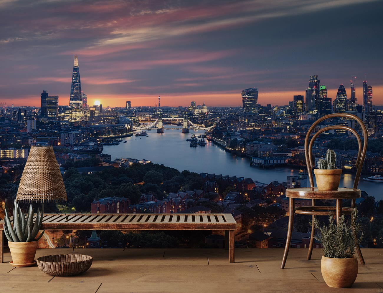 Immerse your space in the captivating allure of the Overlooking London Wallpaper Mural, where a panoramic view of the iconic cityscape at dusk unfurls majestically. The dramatic skyline, with its blend of historic and modern landmarks set against a serene twilight sky, evokes a sense of elegance and sophistication. The intricate detailing and rich textures create a mesmerising focal point that complements an eclectic range of interior designs.