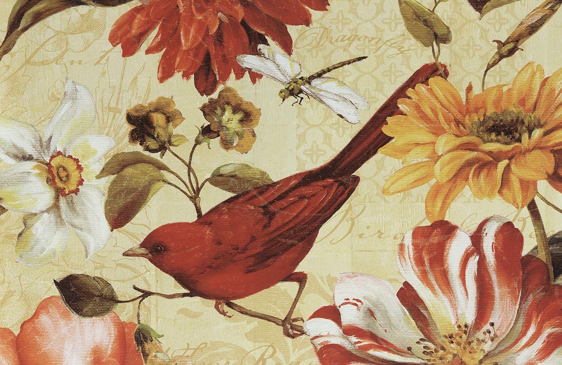 The Painted Bird Floral Wallpaper Mural captivates with its intricate illustration of vibrant flora intertwined with delicately painted birds. Rich shades of red against lush yellow and green hues create a sophisticated tapestry that complements any space. The delicate brush strokes and seamless blend of natural elements invoke a sense of timeless elegance, making it a versatile choice for both classic and contemporary interiors.
