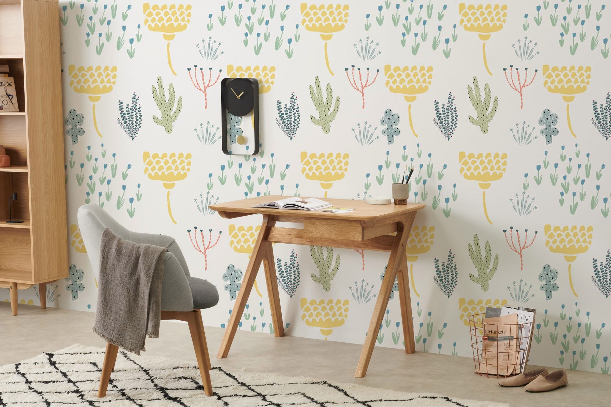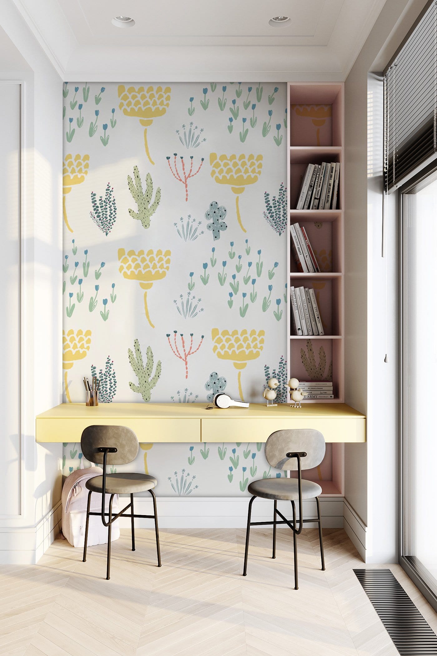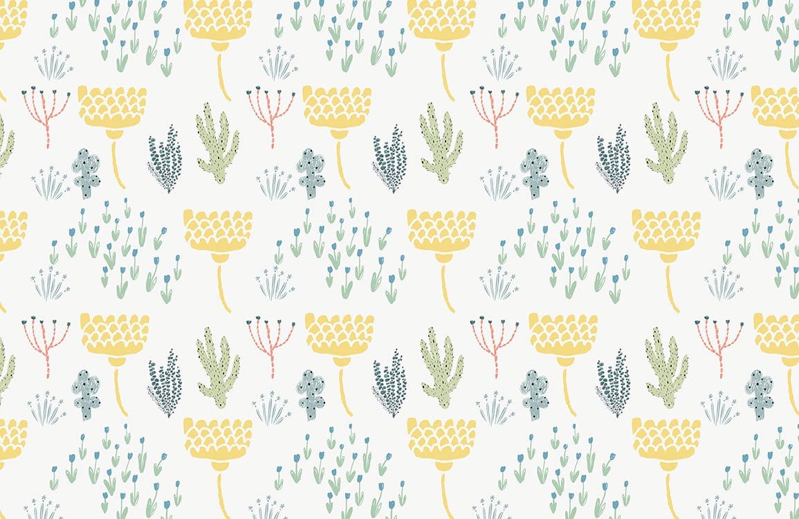 Bring your wall to life with these repeated plants pattern wallpaper mural. Relieve your stress and enjoy the freshness from these small plants in soft pastel colours. Add a peaceful and calm atmosphere to your living room, bathroom, bedroom and dining hall. Work perfectly to your modern style furniture and home decors.