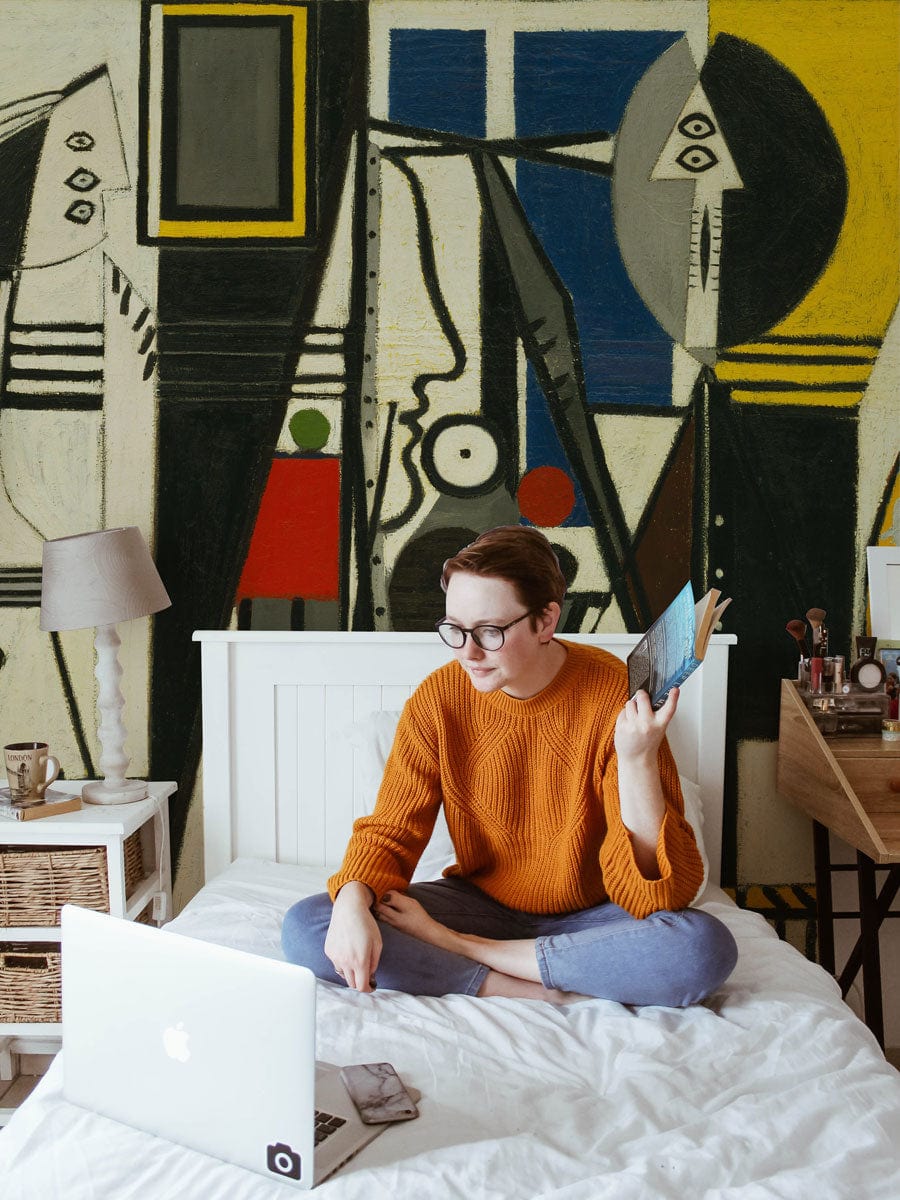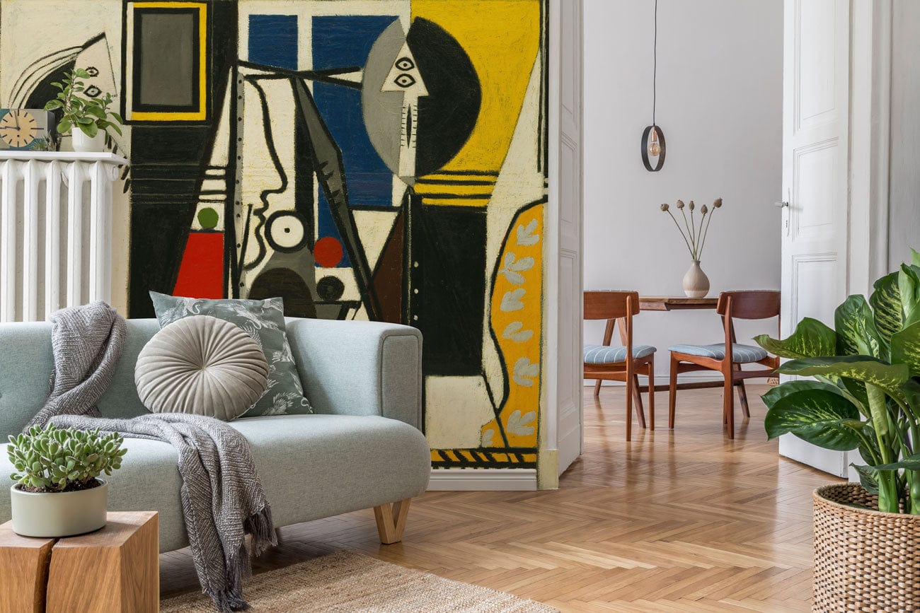 Embrace a fusion of artistic expression with the Painter And Model Wallpaper Mural, where geometric contours and bold colours interplay in a symphony of modern elegance. The mural's intricate design seamlessly integrates fluid abstractions and rigid lines, evoking a sense of harmony and depth. This piece serves as a captivating focal point, adding a layer of sophistication to any environment, whether it be contemporary or traditional.