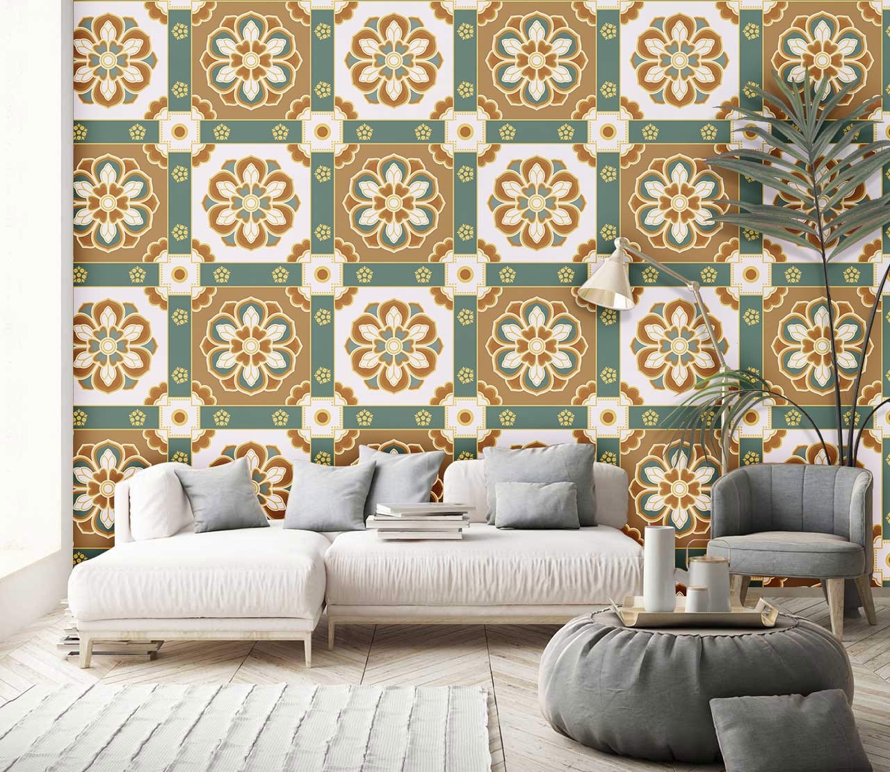 The Palace Style Wallpaper Mural exudes elegance with its intricate floral motifs, set against a harmonious blend of amber, moss green, and cream hues. Its detailed design whispers of opulence and classical artistry, making it a versatile choice for both traditional and contemporary interiors. The rich textures invite a sense of warmth and sophistication, effortlessly complementing a variety of décors.