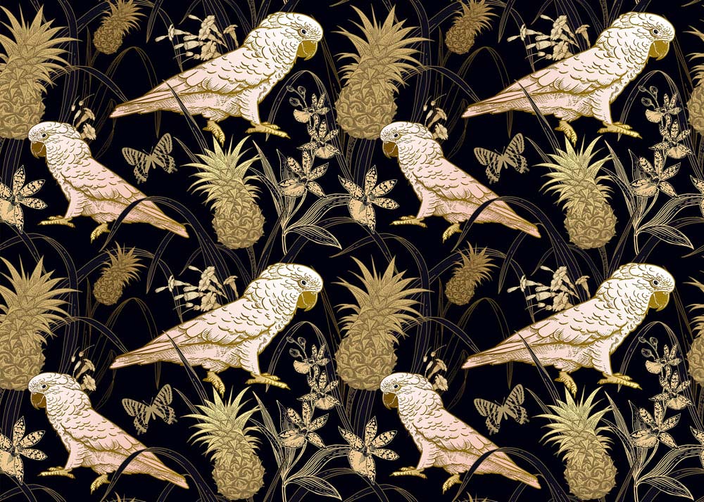 Discover a sophisticated tapestry of nature with our Parrot & Flower Wallpaper Mural. The intricate design features elegantly illustrated parrots amid playful pineapples and delicate florals, all set against a bold backdrop. A perfect blend of artistry and elegance, this mural seamlessly introduces a touch of the exotic into any space while retaining a timeless charm, suitable for classic or contemporary interiors.