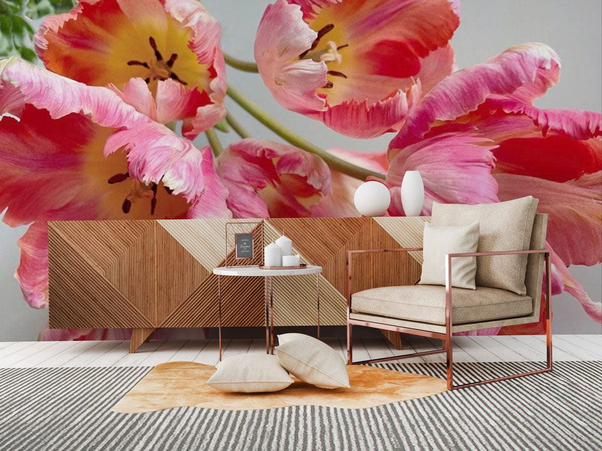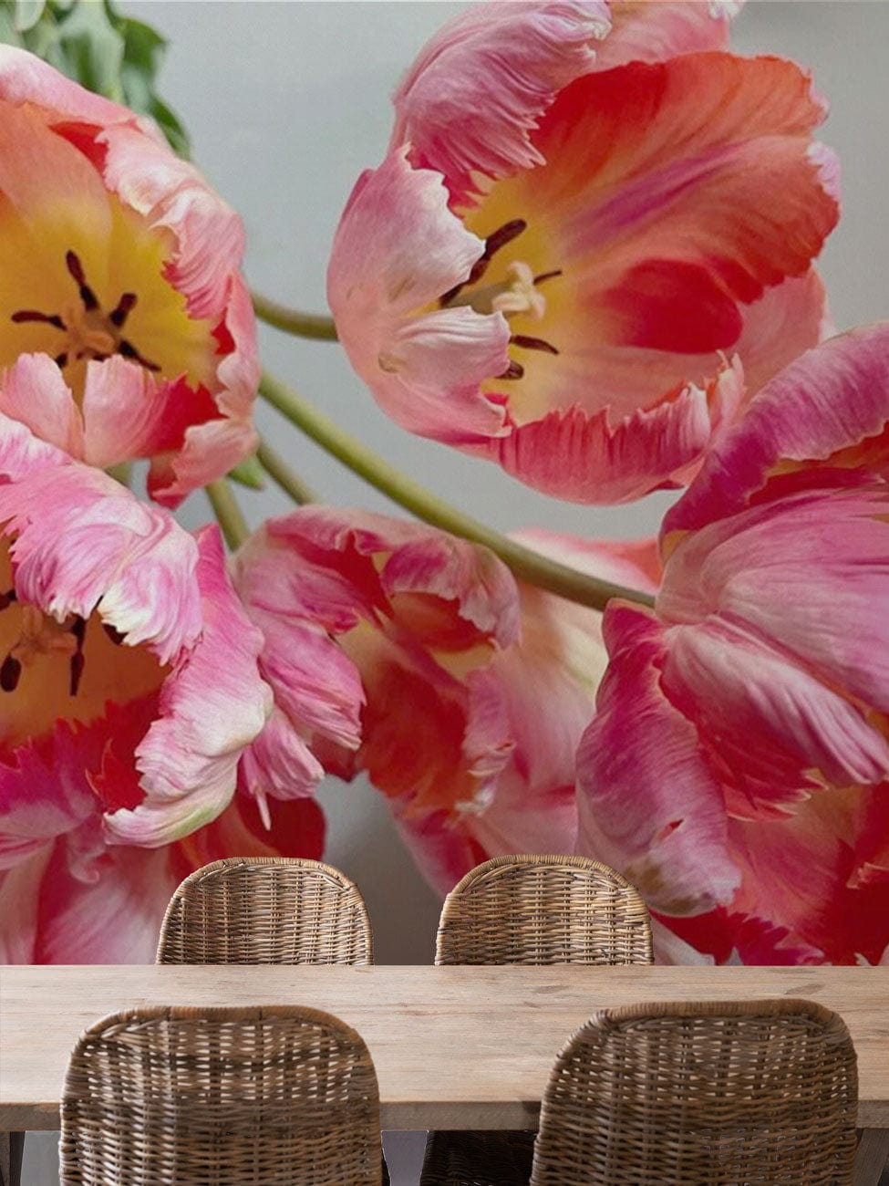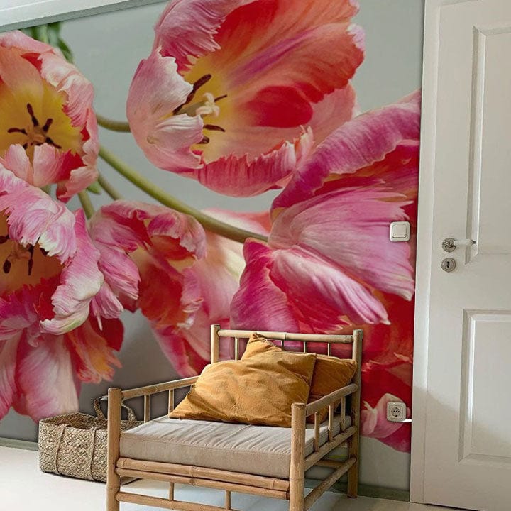 Immerse your space in an artist's dream with the Parrot Tulips Wallpaper Mural. The striking display of vibrant tulips, delicately unfurling in a symphony of shapes, dances across the canvas, drawing the eye with its elegant curves and stunning detail. Each petal, a masterpiece of nature, combines brilliant hues and intricate textures, making it an ideal centrepiece for any interior. This mural effortlessly bridges classic artistry with a contemporary flair, inviting a sense of sophistication and warmth to any room it adorns.