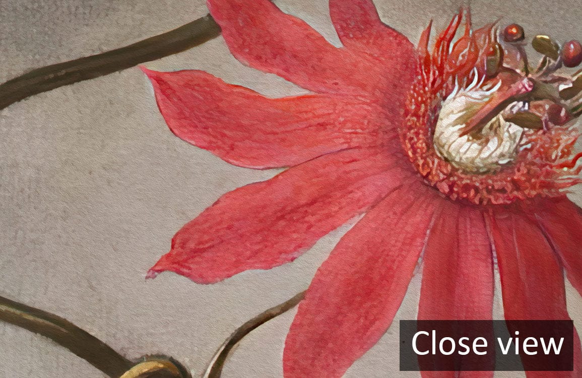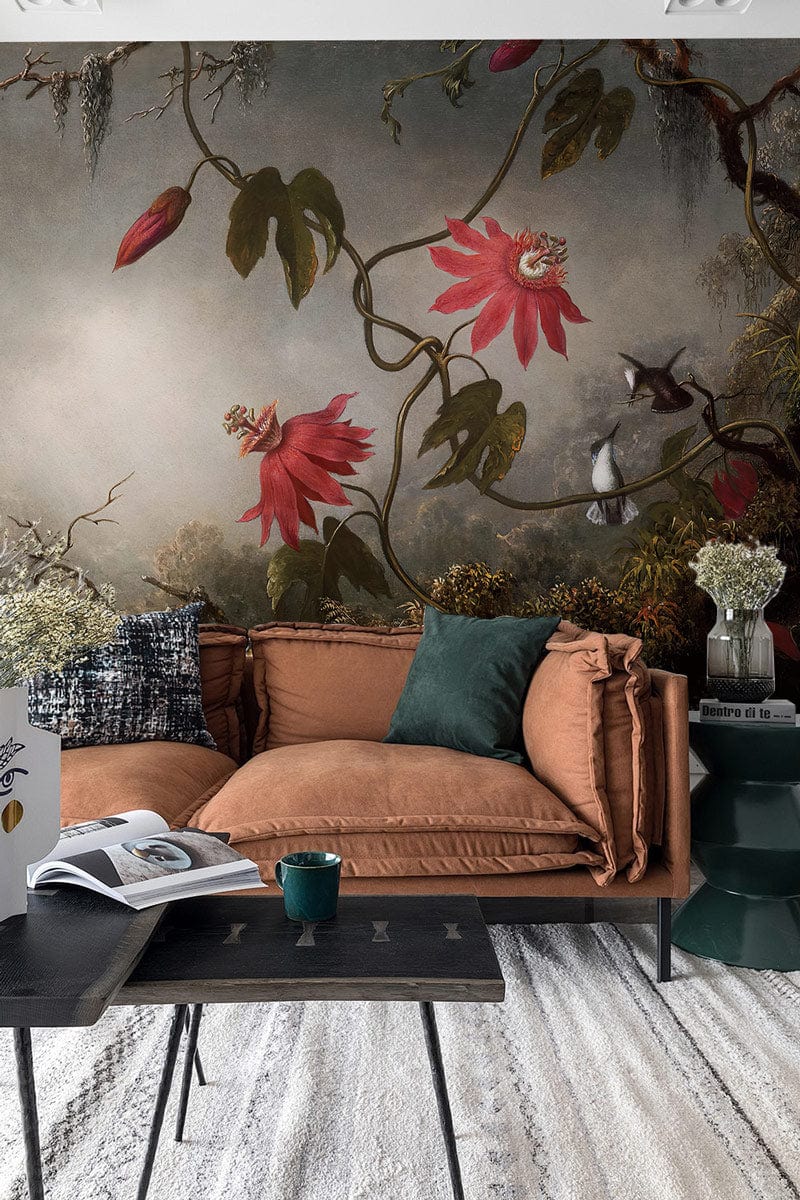 The Passionflower Enchantment Mural Wallpaper captures the untamed beauty of nature with its exquisite depiction of climbing passionflowers and vibrant hummingbirds. The lush design and intricate botanical details evoke a serene and timeless elegance, ideal for creating a luxurious ambience in any space.