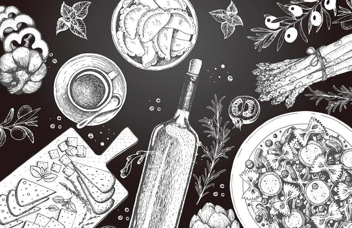 Immerse yourself in an exquisite culinary tableau with our Pasta Dinner Wallpaper Mural. Adorned with intricate illustrations of classic Italian ingredients, this design exudes a sophisticated charm. The black and white palette contrasts gracefully to highlight each artistic detail, creating a timeless and elegant atmosphere. Perfectly suited for both traditional and contemporary settings, it serves as a refined backdrop for any interior.