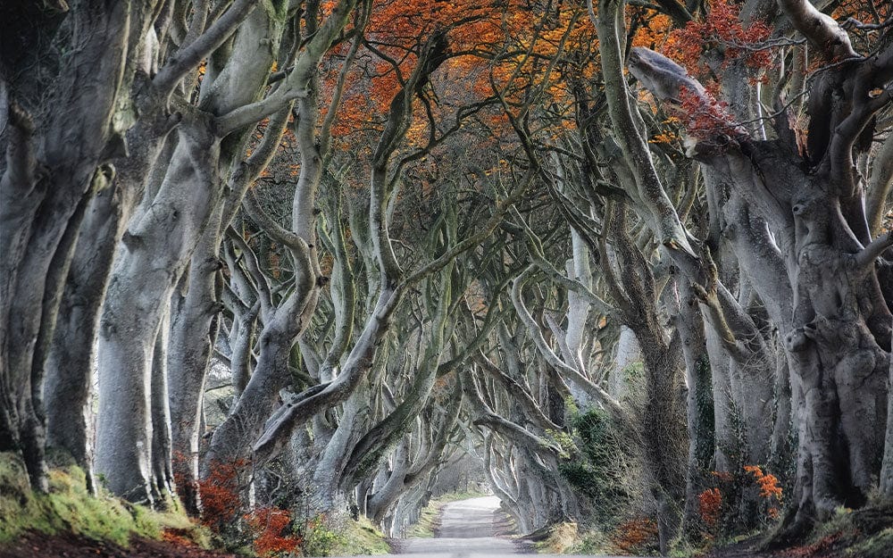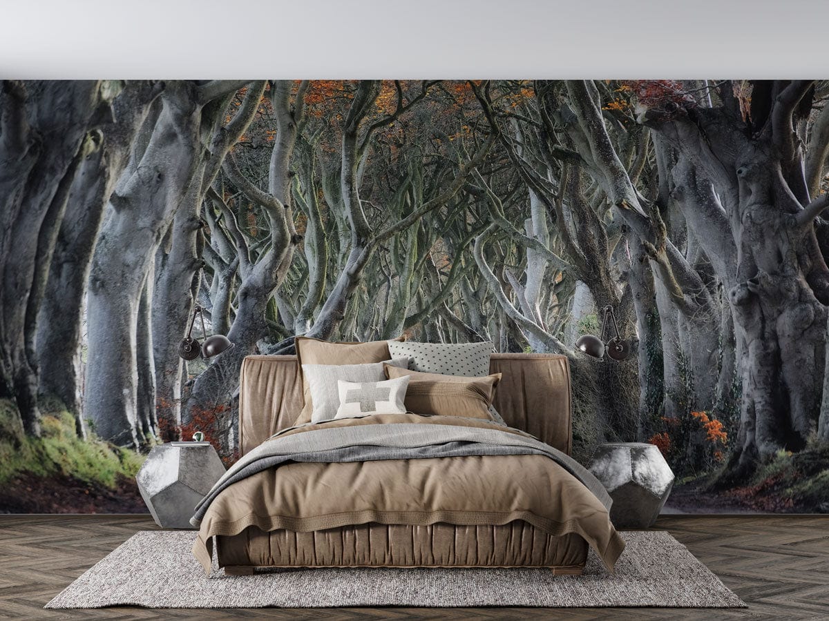 The Path to Happiness Wallpaper Mural offers an immersive journey through a majestic avenue of gnarled trees with interlocking branches, creating a natural canopy overhead. Its intricate design captures the play of light filtering through a tapestry of burnt orange and deep green foliage, evoking a sense of tranquil elegance. Perfect for elevating any interior space, this mural complements settings with its timeless artistic appeal.