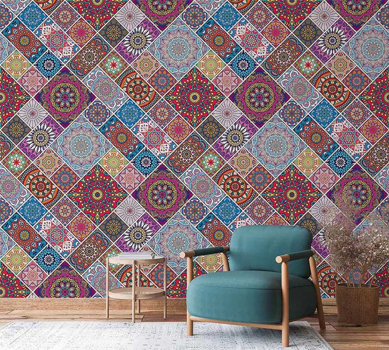 The Pattern Mixture Wallpaper Mural intricately weaves a tapestry of geometric motifs and floral accents, creating a rich visual narrative that exudes timeless elegance. The mural's harmonious blend of vibrant colours and detailed patterns invites warmth and sophistication into any space, making it an exquisite choice for diverse interior settings.