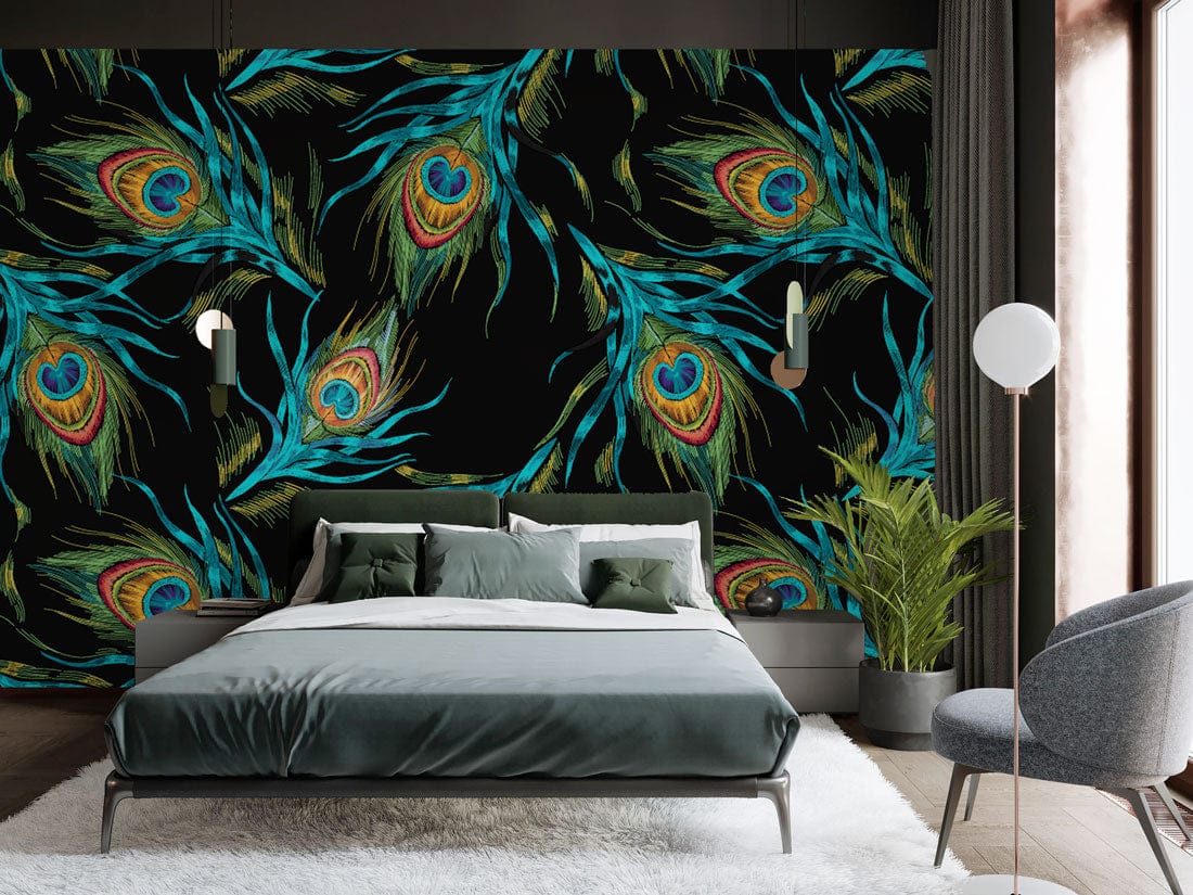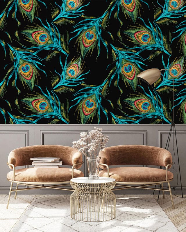 The Peacock Feather in Dark Wallpaper Mural exudes elegance with its intricate design of peacock feathers delicately sketched against a rich black backdrop. The detailed patterns effortlessly bring a sense of opulence and artistic flair, making it an exquisite addition to any room. The stylish blend of vibrant azure and emerald hues evokes a timeless charm, ensuring it integrates seamlessly into both classic and contemporary interiors.