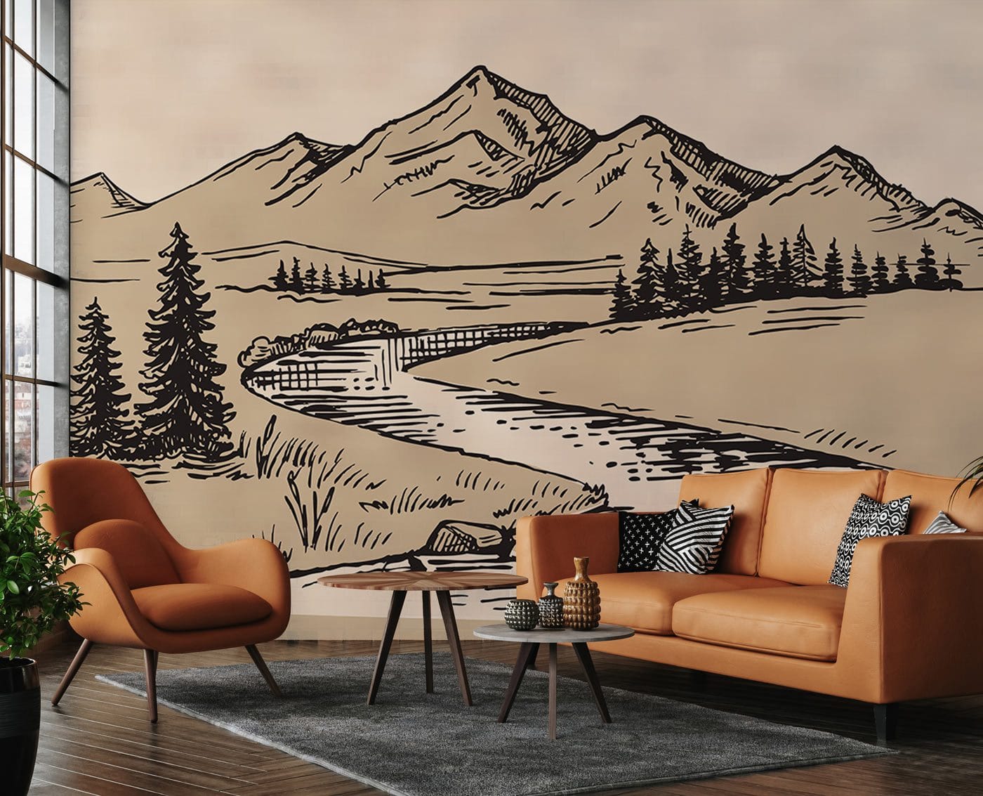 The Piedmont Wallpaper Mural invites a serene outdoor essence indoors with its captivating landscape design. Delicate linework illustrates towering mountains, flowing rivers, and picturesque pine trees, creating a harmonious scene that exudes tranquil sophistication. This mural effortlessly adapts to a range of interiors, offering an artistic focal point that complements both classical and contemporary decor.