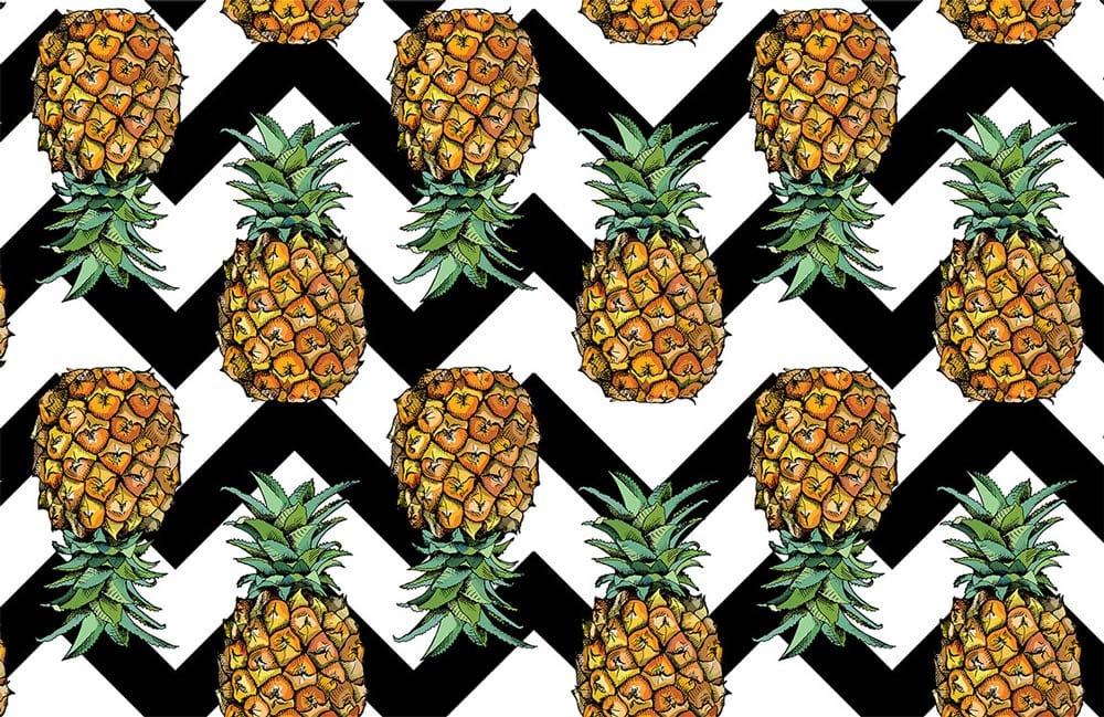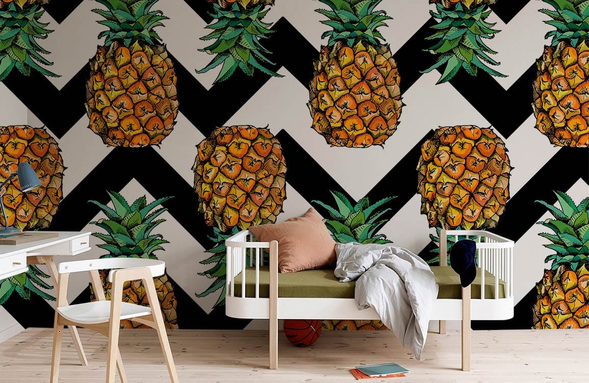 Add a tropical vibe to your bedroom with this pineapple wallpaper mural. These pineapple waves patterned in kamikaze-style feature a fun and colourful pineapple layout, giving your room a summer look. The wallpaper mural has a natural colour palette of yellow and green in the foreground, and black and white waves in the background, making it ideal for any tropical-themed room. This design is the perfect way to highlight your architecture and make it look even better while creating a relaxing environment for you and your guests at any time of day.