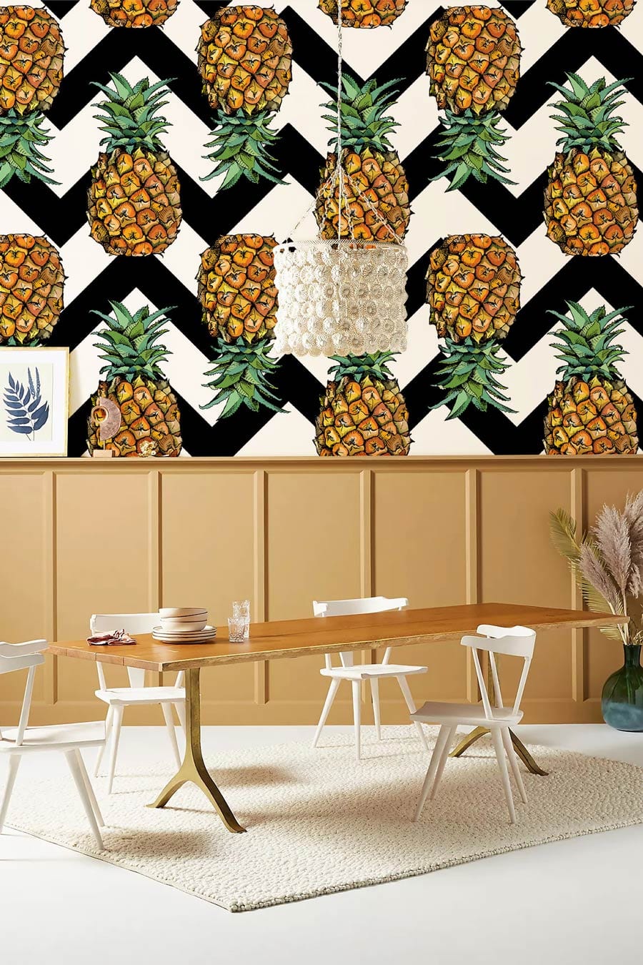 Immerse your space in vibrant elegance with the Pineapple Waves Wallpaper Mural, where rich golden hues of the pineapples dance against bold black and white zigzags. This striking design radiates zest and creativity, making it a versatile choice for both contemporary and eclectic interiors. With its intricate textures and captivating patterns, this mural offers an inviting and artistic ambience, perfect for enlivening any room with a touch of sophistication.