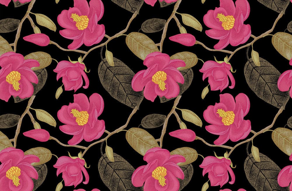 The Pink Blossom Wallpaper Mural embodies a picturesque floral design, showcasing vivid pink blossoms intertwined with lush green foliage, set against a deep black background. This exquisite mural captures the essence of sophisticated artistry, effortlessly adding a timeless charm to any space, while its intricate detailing and rich textures invite a serene ambience.