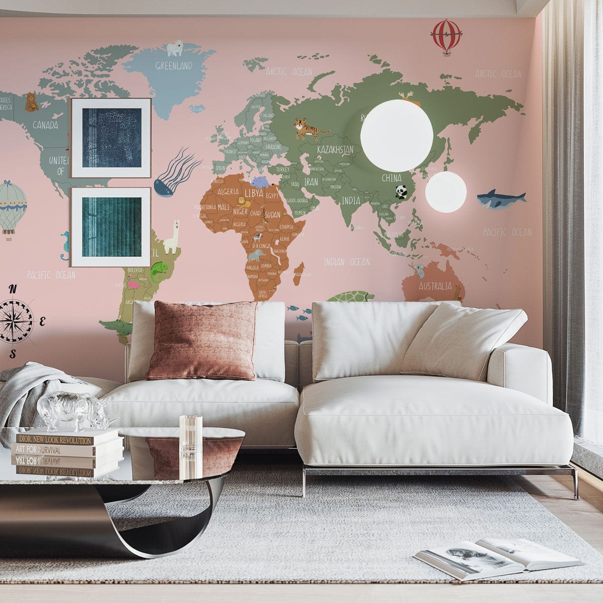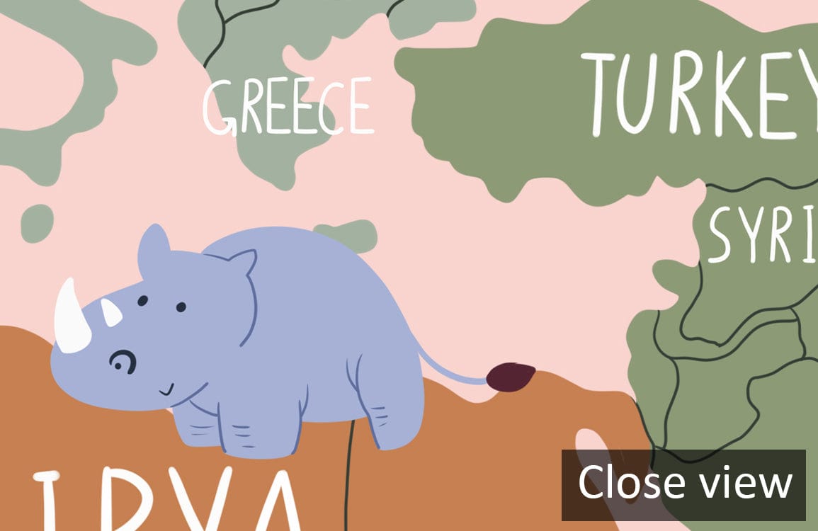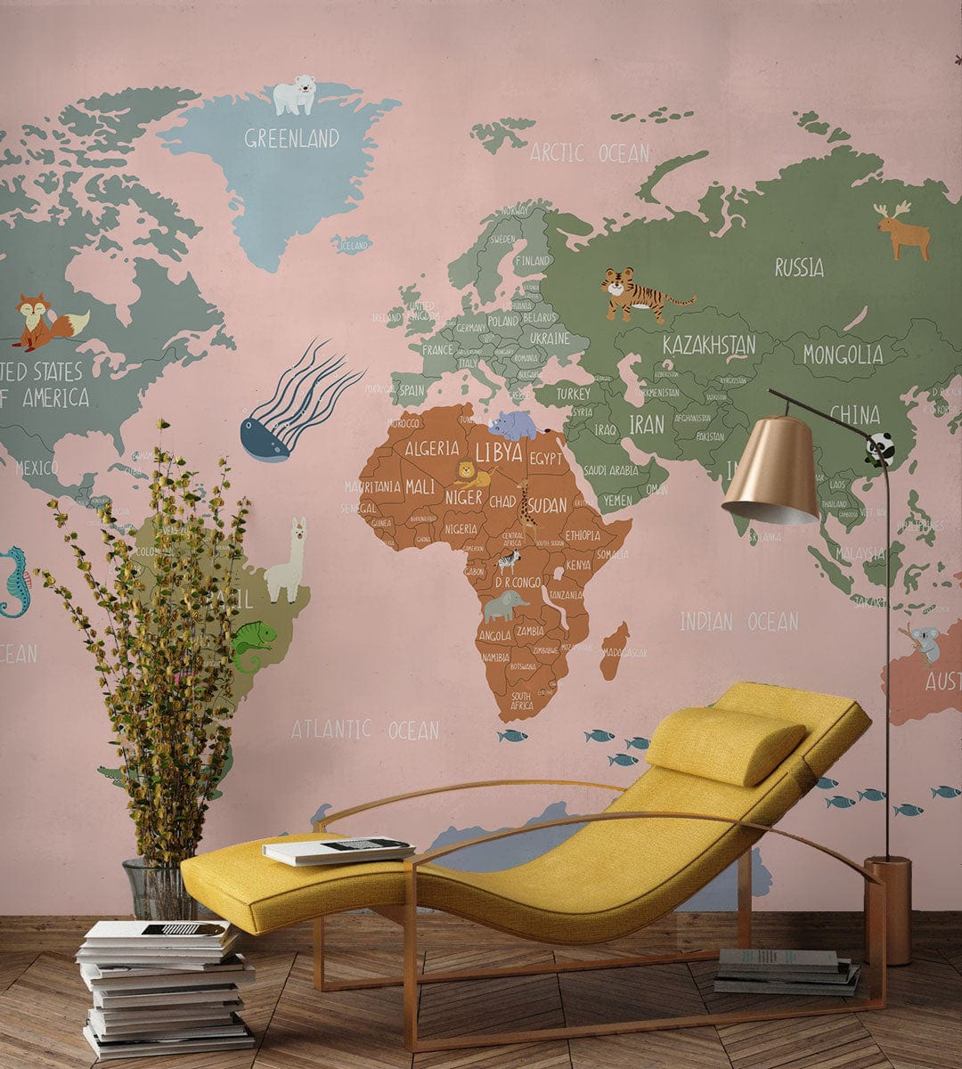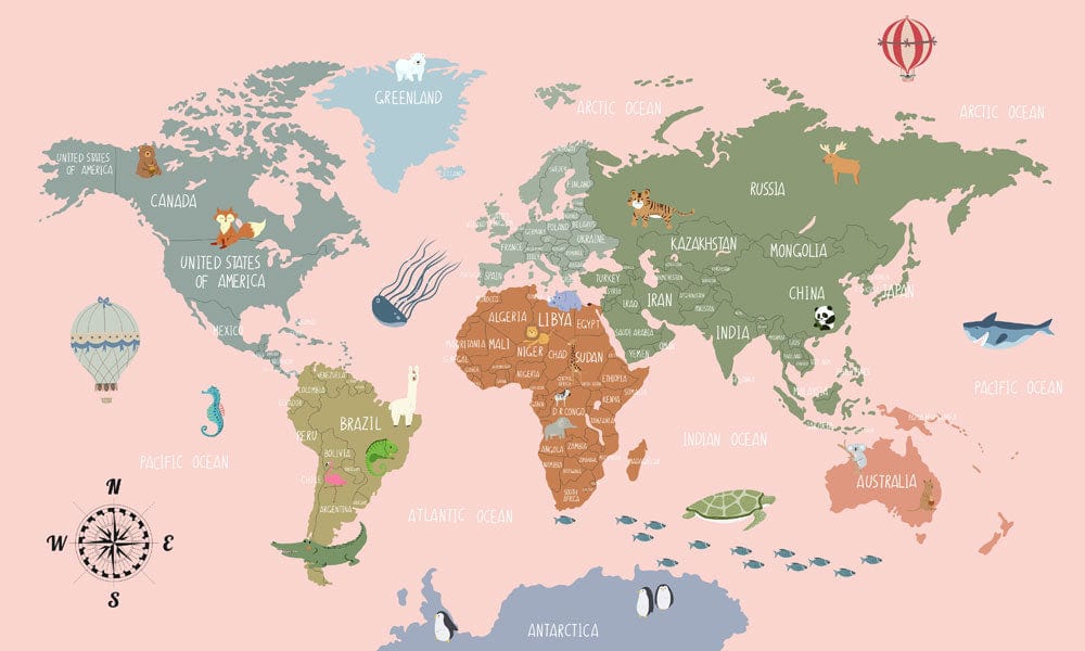 This Pink Cartoon Map Wallpaper Mural offers a delightful fusion of whimsy and sophistication, featuring an intricate world map with charming animal illustrations across continents. Its detailed artistry and pastel palette create a soothing backdrop, effortlessly complementing both contemporary and classic interiors. This mural's intricate design invites exploration, making any room feel both inviting and worldly.