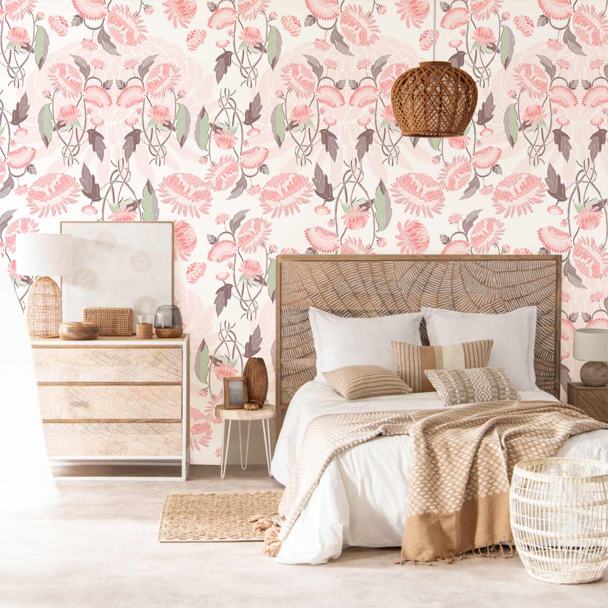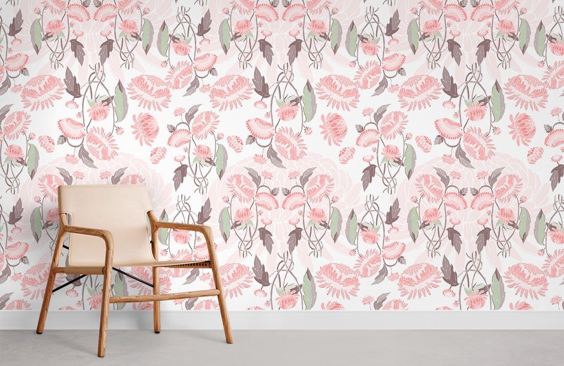 This exquisite Pink Floral Wallpaper Mural weaves a tapestry of delicate blossoms and graceful foliage. Its subtle blend of pastel pinks and soothing greens create an aura of tranquillity and elegance, while the intricate details echo the timeless charm of nature. Ideal for a living room or bedroom, this mural's sophistication adds a refined layer of artistry to any space.