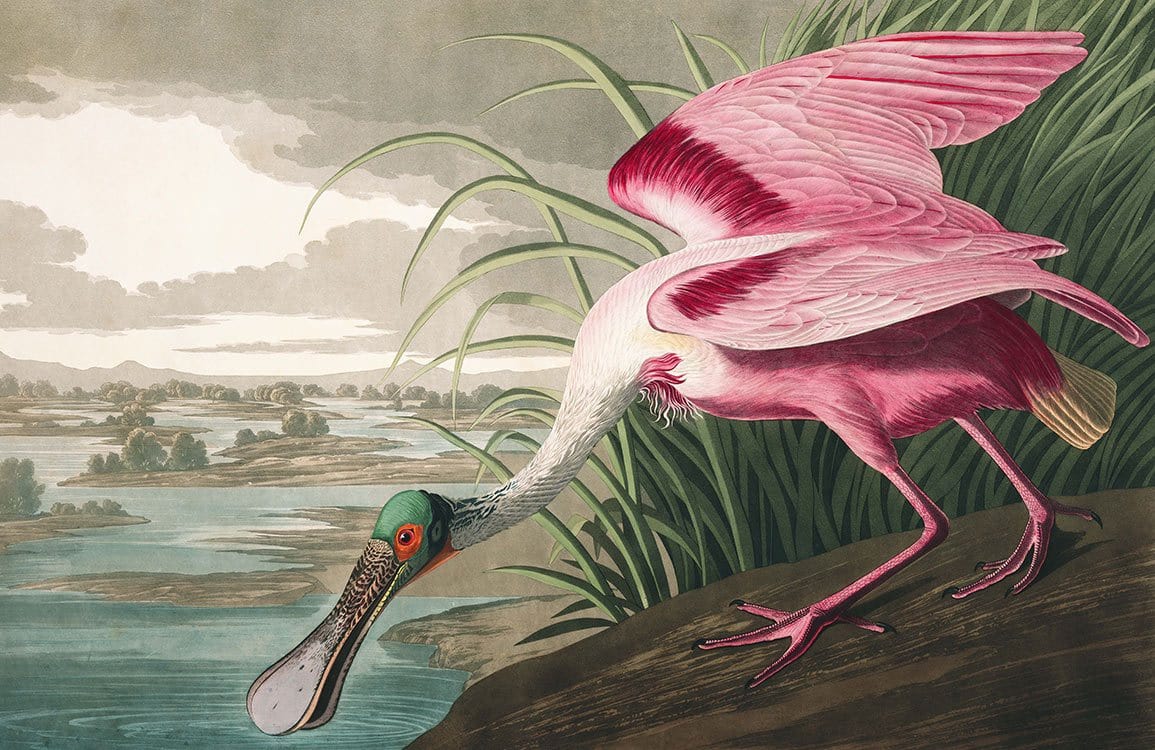 This pink heron wallpaper mural is ideal decor to use as a background. This beautiful, amazing painting of a large pink heron catching fish by the lake will be perfect for the indoors in your home. Interesting rendering with a natural atmosphere and a refreshing wall decoration perfect for any day and affable name: creatures with green scenes.