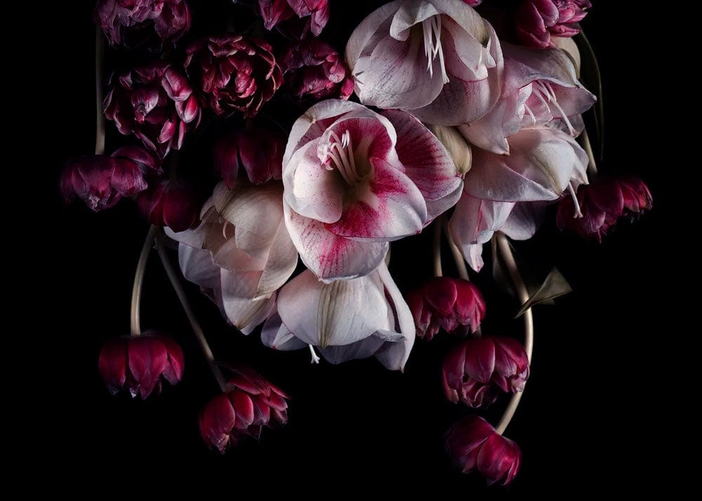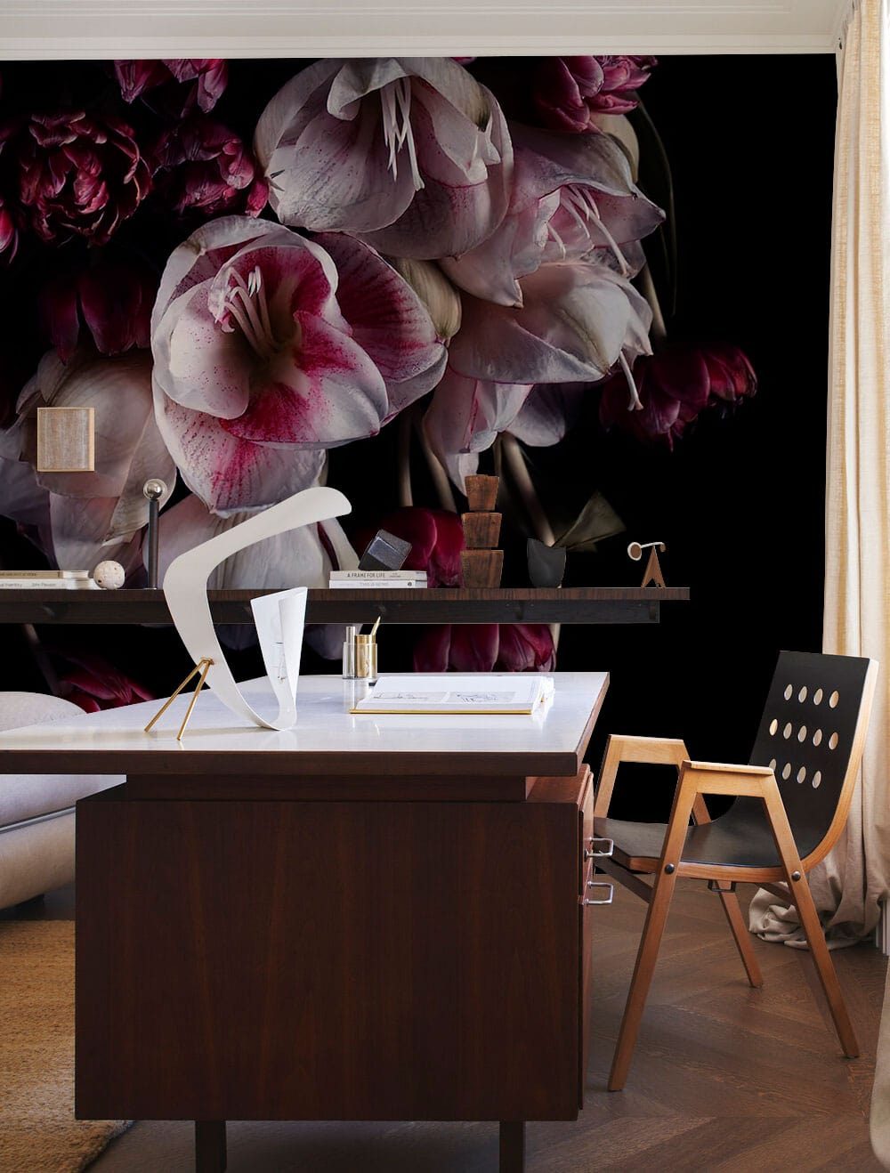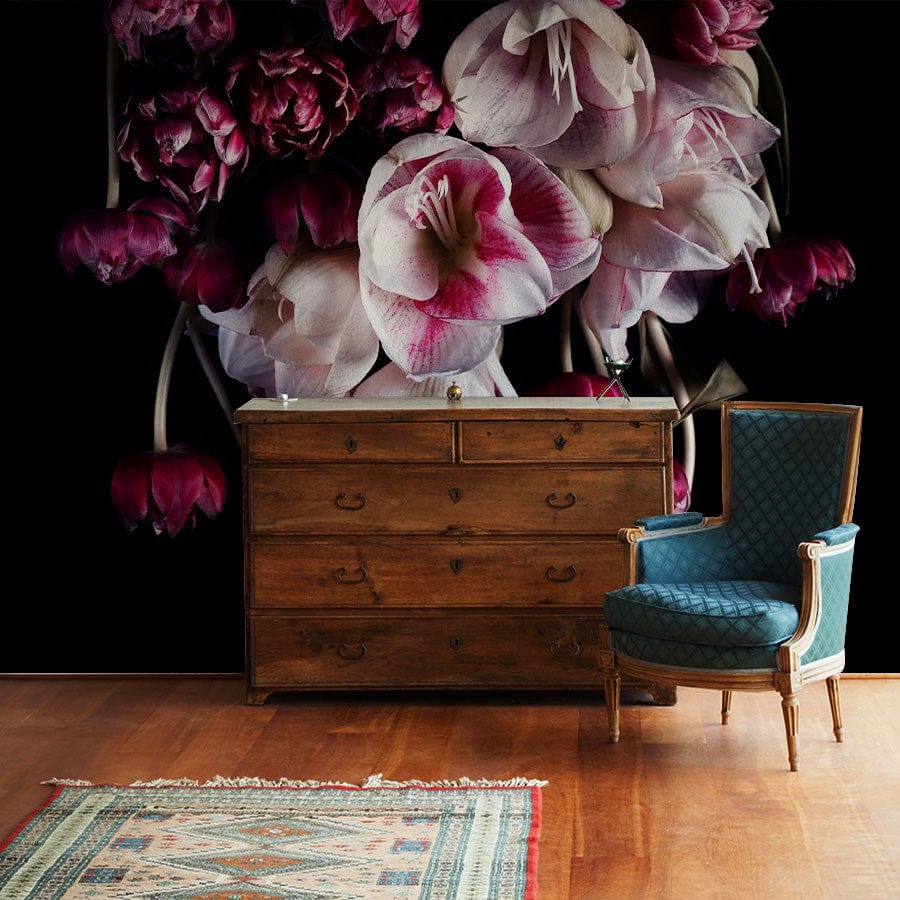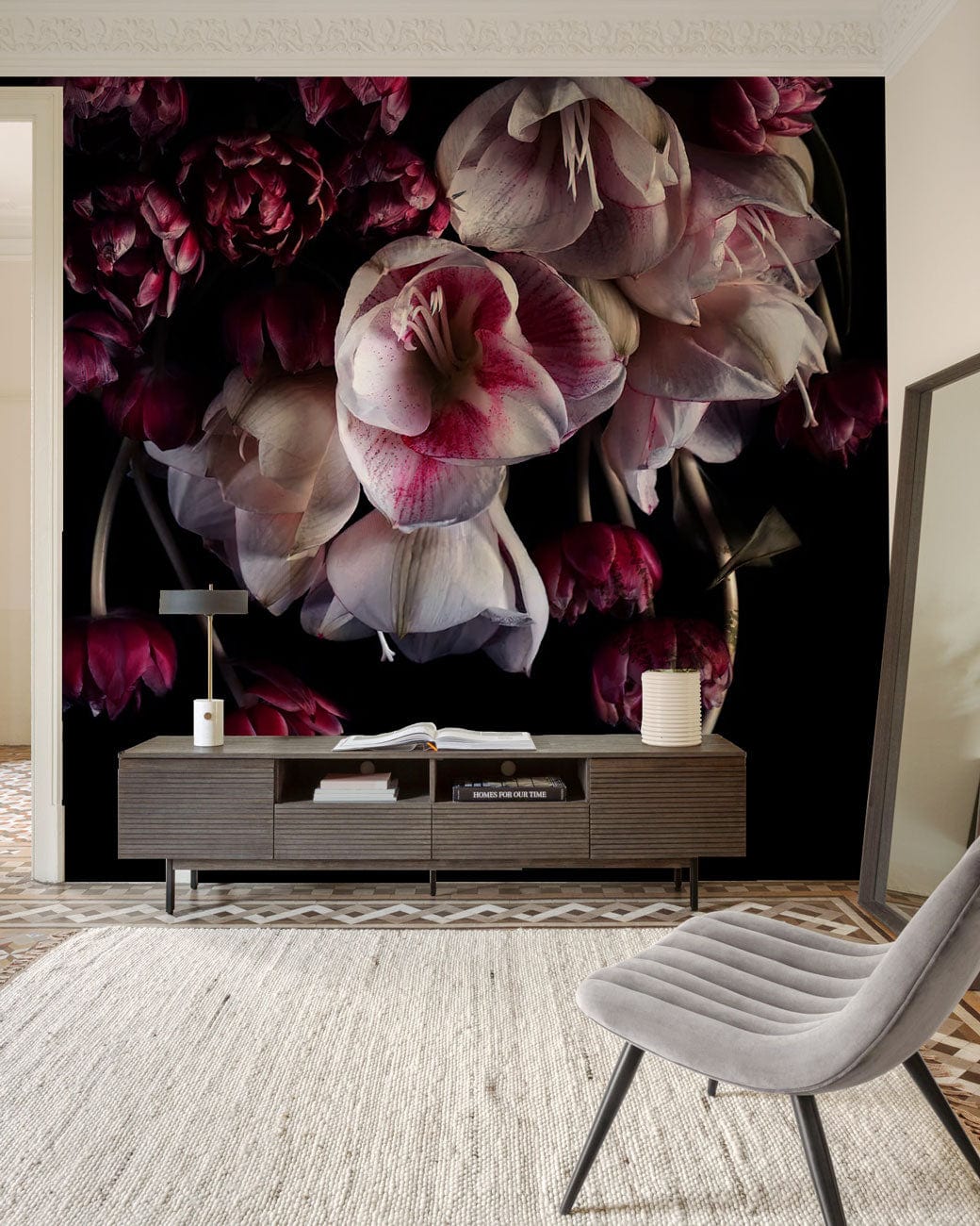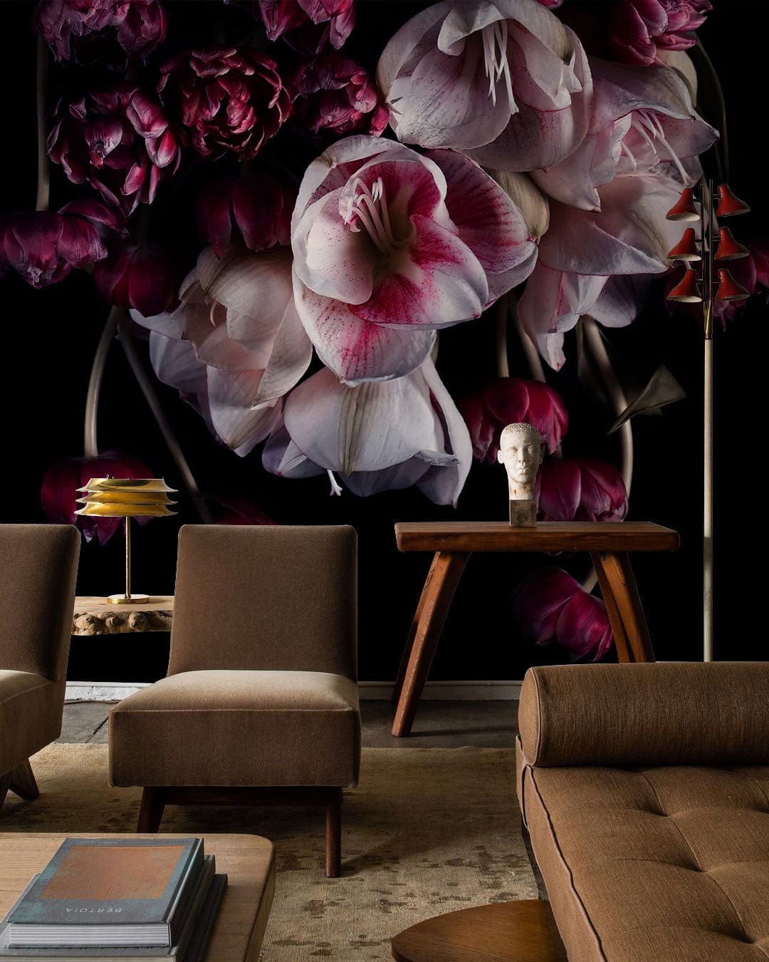This stunning wallpaper mural showcases an opulent floral arrangement against a dramatic dark backdrop, bringing an air of sophistication and depth to your space. The delicate balance of soft pink petals intertwined with rich burgundy flowers creates a visually compelling piece, perfect for adding a touch of classic elegance to any room. Its intricate design captures the essence of timeless beauty, making it a versatile choice for both contemporary and traditional interiors.