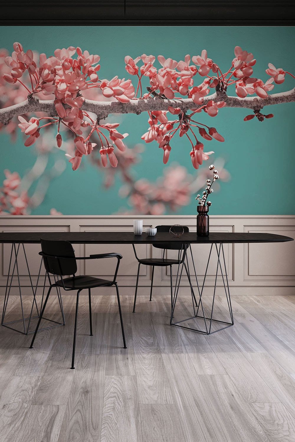 Install this beautiful pink flower wallpaper in your bedroom, living room and dining hall that it acts as an extension of your space. Adorn the walls in a bright blue tone with vivid pink flowers surrounding you. This gorgeous wall mural will garuantee to add instant freshness to your rooms and impress you and your guests.