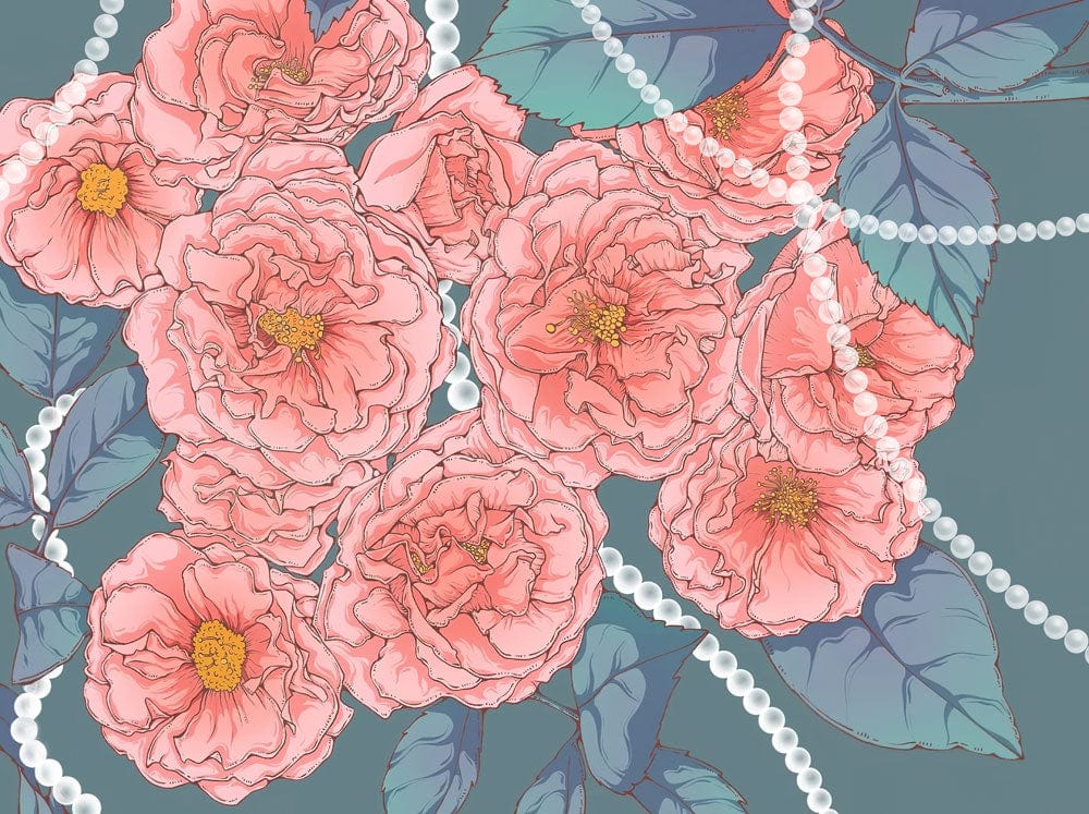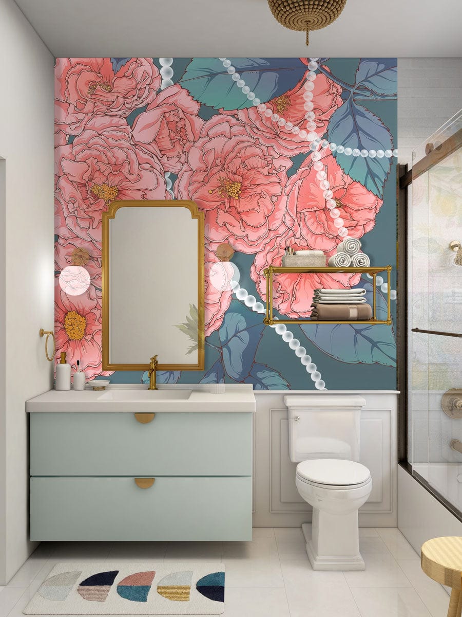 Immerse your space in the delicate allure of Pink Petals Jewellery Wallpaper Mural, where exquisite pink blossoms intertwine with lustrous pearls against a soothing teal backdrop. This mural captivates with its intricate floral design and sophisticated palette, bringing a touch of timeless elegance to any interior setting. Each petal is meticulously detailed, capturing the essence of nature's beauty with an artistic flair that suits both contemporary and classic styles.