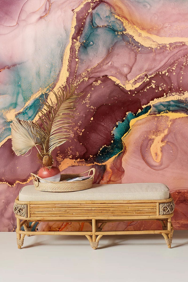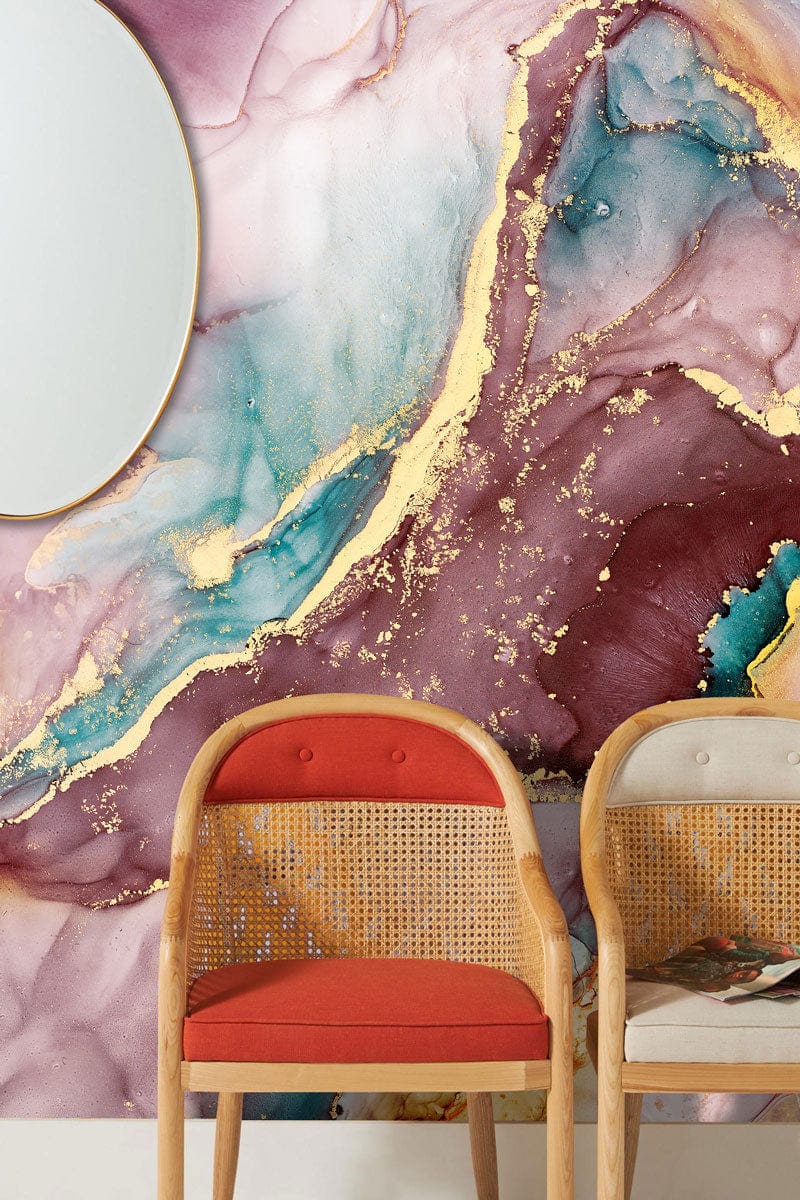 Immerse your space in the artistic elegance of the Pink Tidal Marble Wallpaper Mural. Its intricate design swirls with rich, deep purples, soft pinks, and highlights of turquoise, all elegantly veined with gold. This mural effortlessly creates an atmosphere that resonates with sophistication and a timeless allure, suitable for any modern or classic decor scheme. Whether adorning your living room, bedroom, or office, it imbues each space with a refined sense of artistry and luxury.