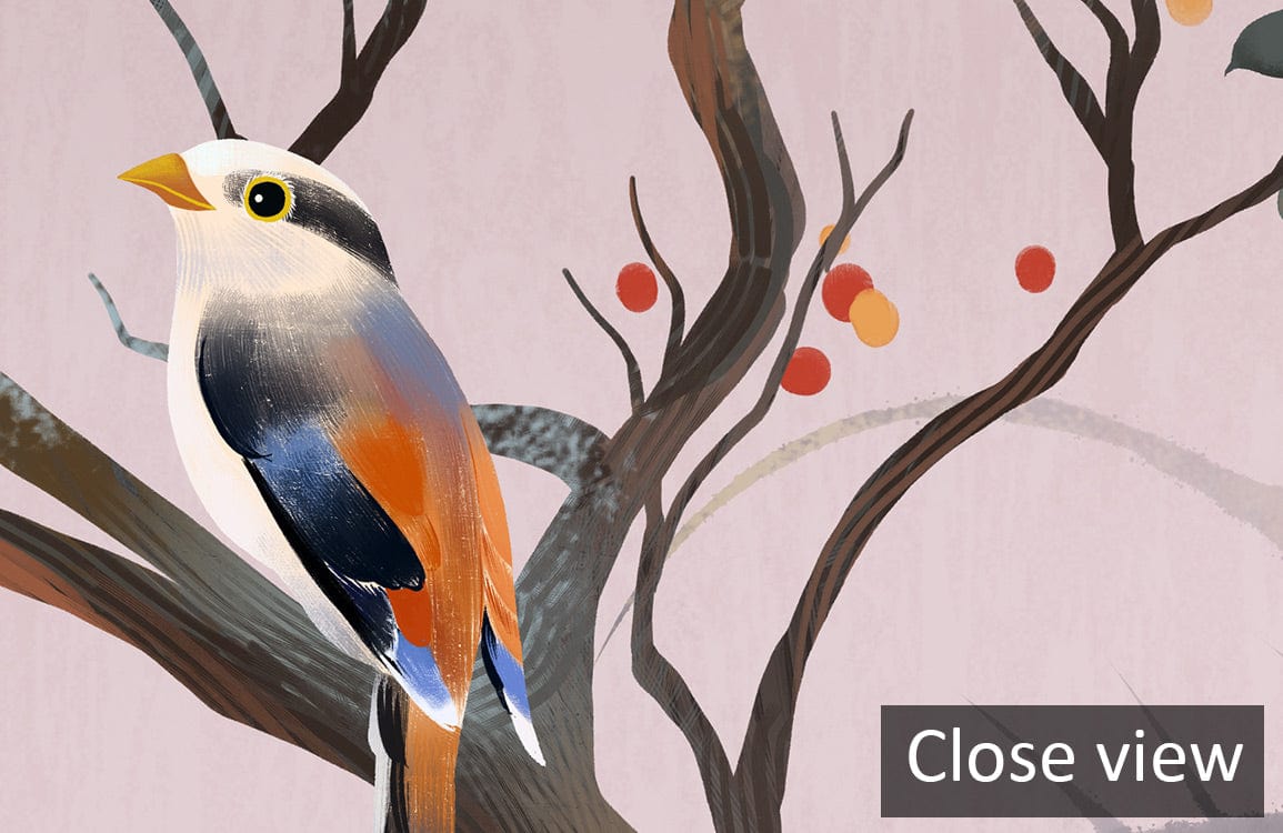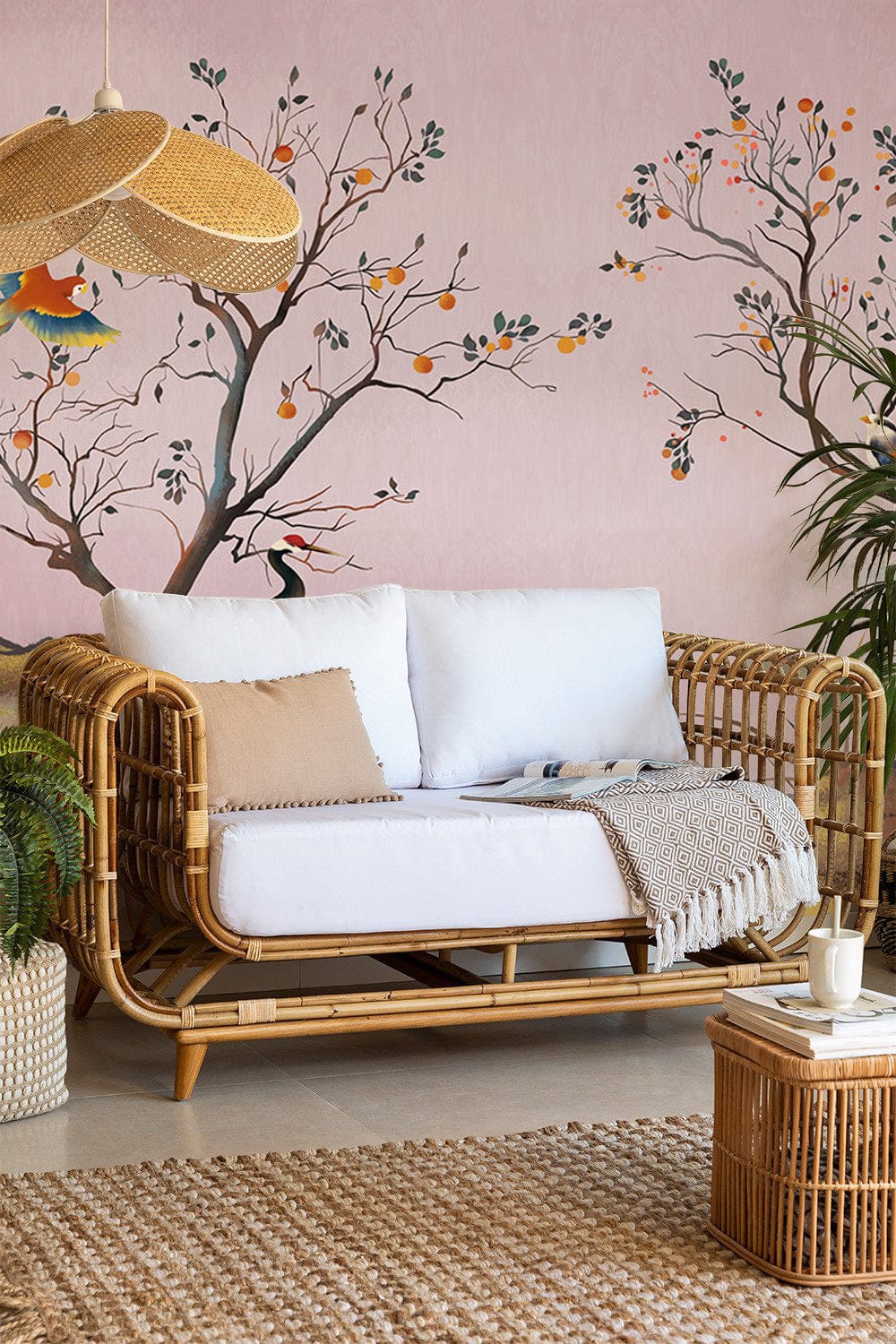 Immerse your space in timeless elegance with this Pink Vintage Wallpaper Mural, featuring delicate trees adorned with exotic birds and serene landscapes. The soft pink backdrop is perfectly accentuated by intricate details, creating an atmosphere of peaceful sophistication. Ideal for adding a touch of nature's artistry to any room, this mural effortlessly complements both classic and contemporary interiors.