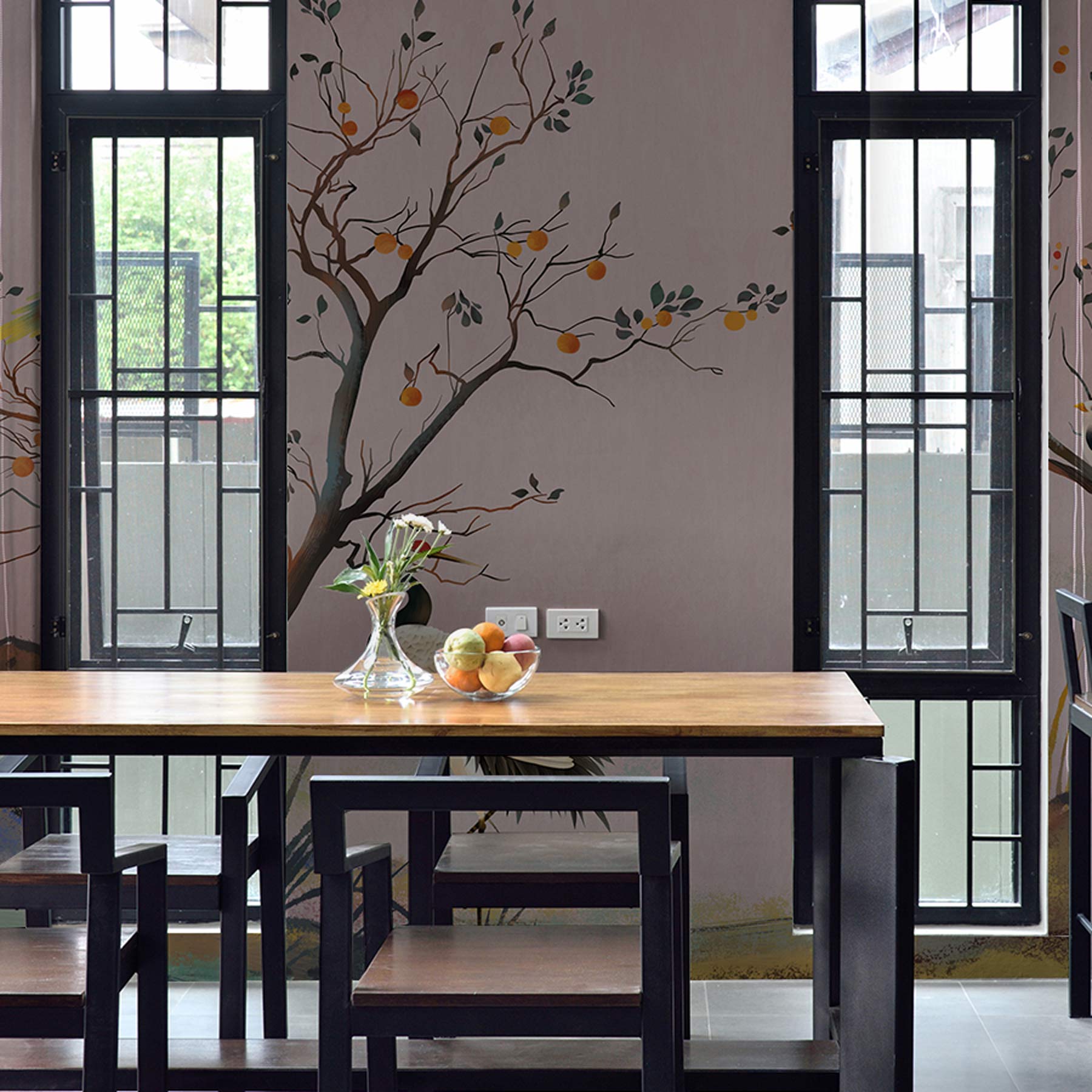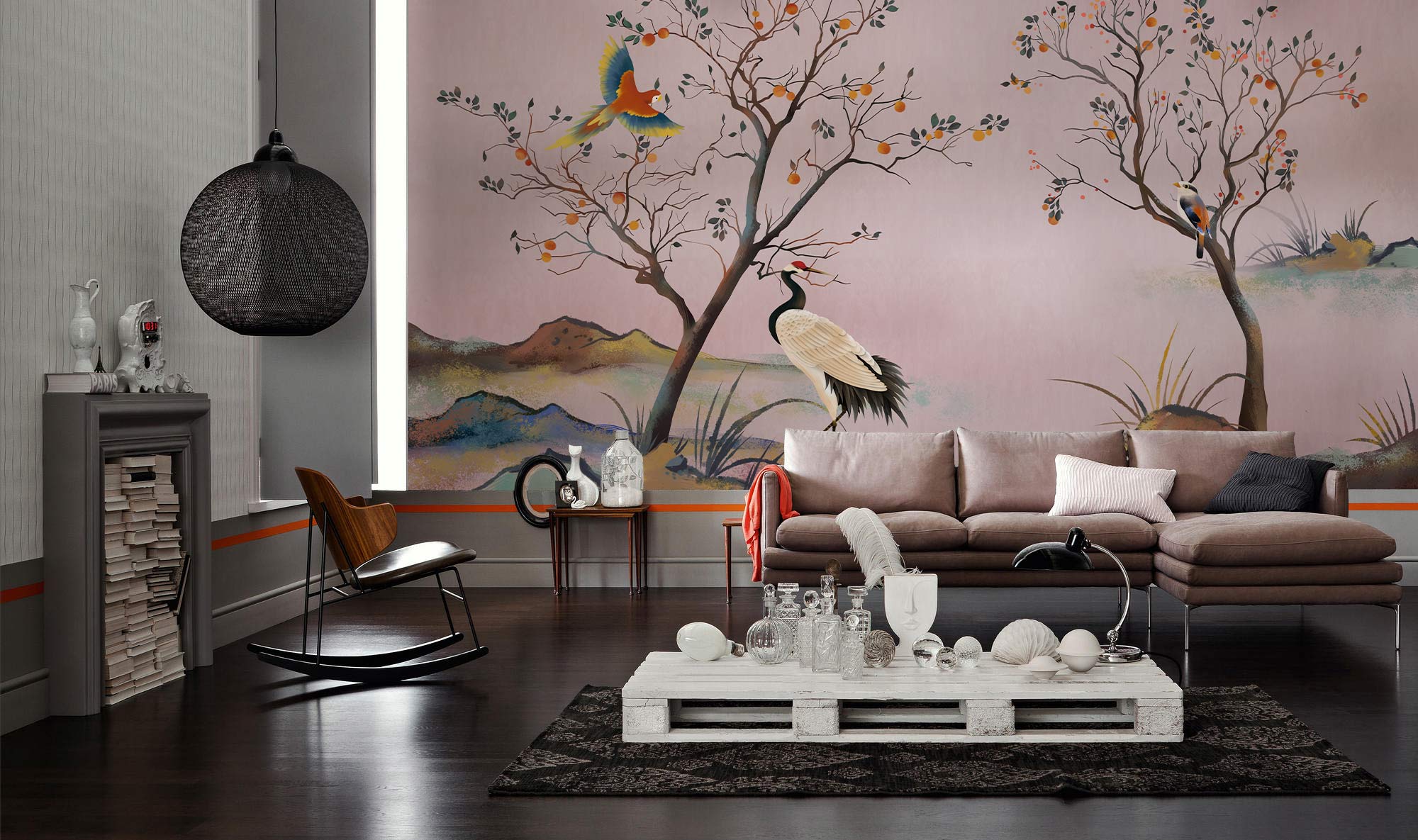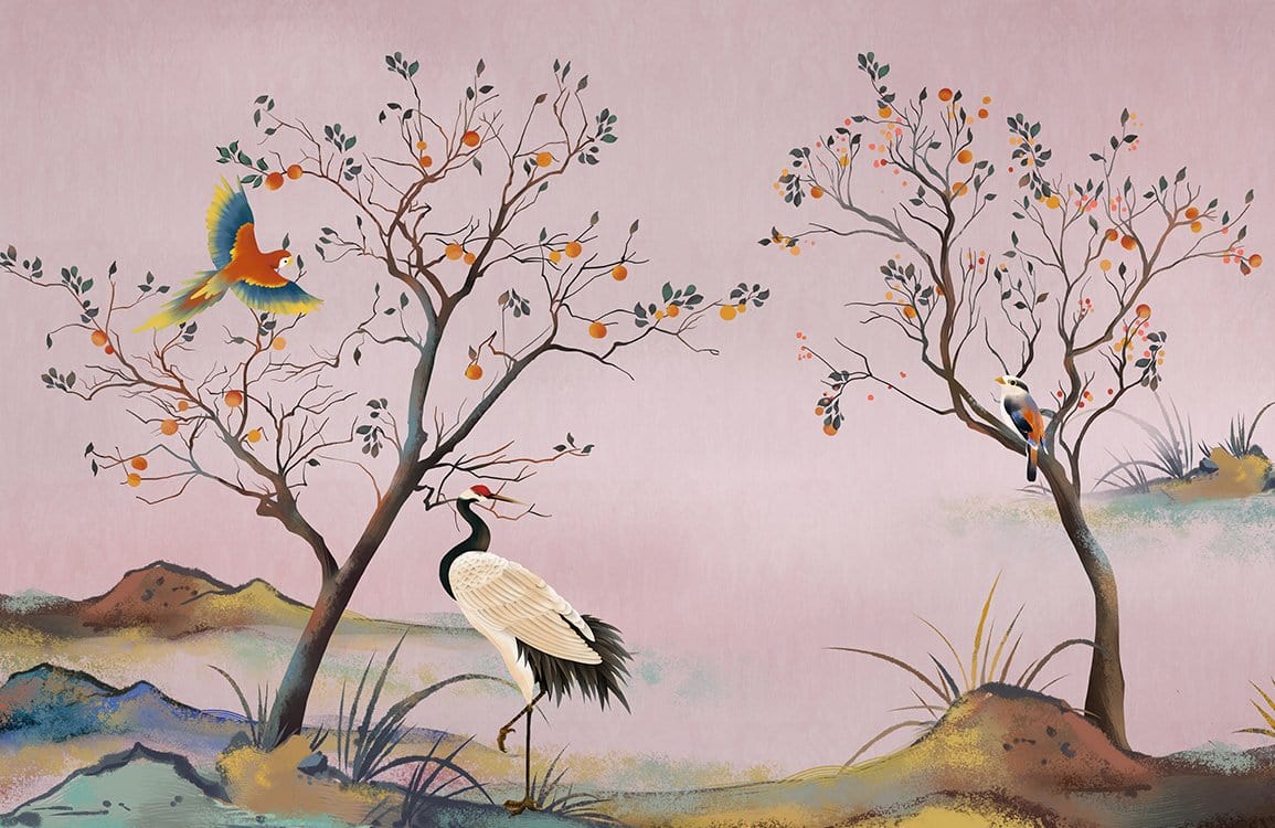 Feel this peaceful moment with this vintage style wallpaper mural. This wall mural is designed with tree, birds & crane in pink tone background, which will surely bring a old-fashioned yet stylish look to your space. Perfect wallpaper that works well with all your bedroom, living room, hallway and dining area.