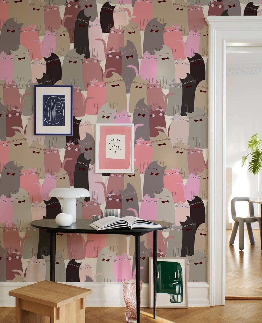 Immerse yourself in the charming allure of the Pinky Cat Couples Wallpaper Mural, where whimsical feline couples grace the design with playful elegance. Soft hues of pink, grey, and cream blend effortlessly to create a tapestry of endearing visuals that exudes warmth and joy. Perfectly suited for diverse settings, this mural infuses a delightful character into any space, inviting a sense of artistic harmony and gentle sophistication.