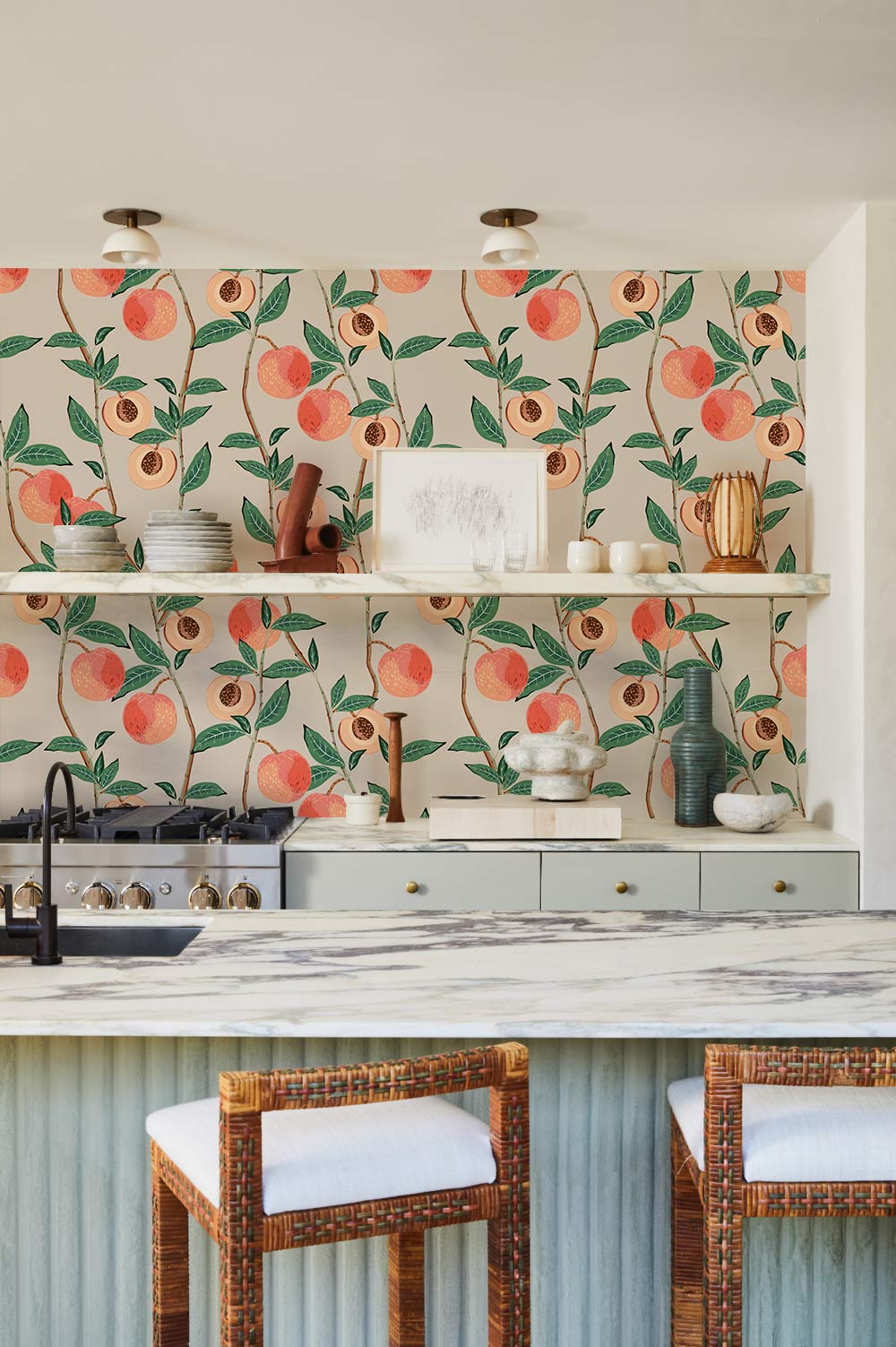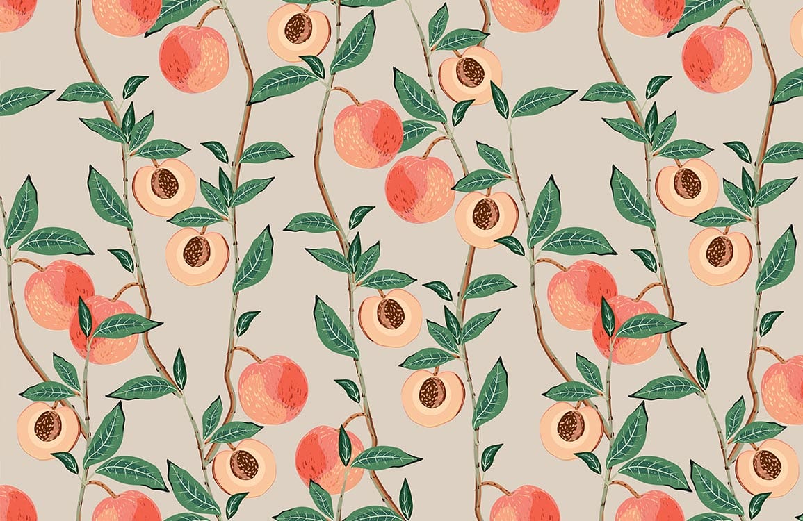 Share a hint of the tropics with our peach mural wallpaper. Playful, plush slices of peach fruit patterned wallpaper will give your room the look and feel of a fun dining experience! Pairing perfectly with contemporary or traditional decor, the pattern features peaches on a soft brown background. This wallpaper is charming and the peach pattern spells warmth and happiness. Vibrant colour with the peaches on the wall creates a romantic decoration for your bedroom or kitchen.