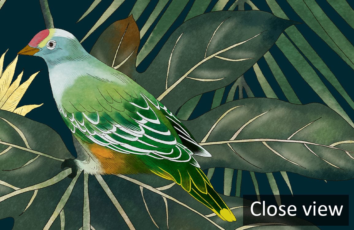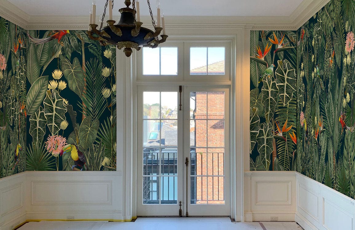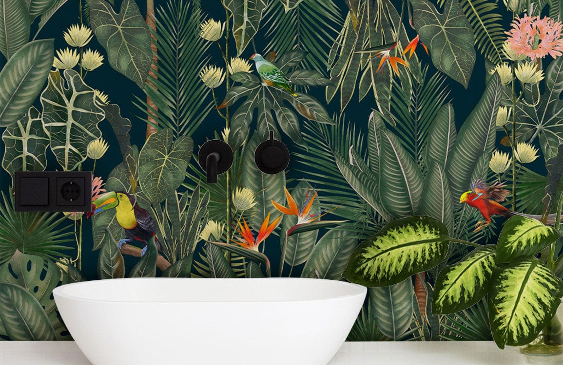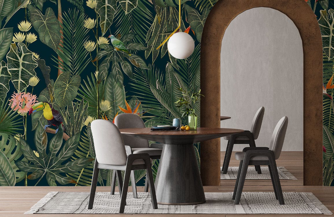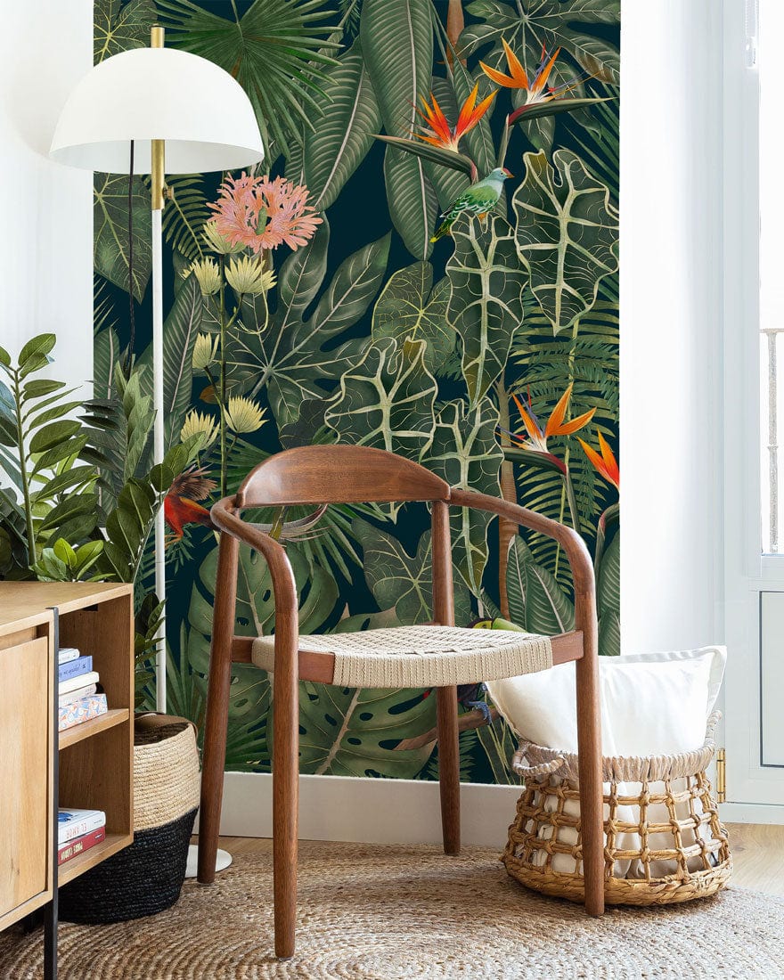 The Plants Corner Wallpaper Mural exudes a rich tapestry of lush greenery and vibrant florals, intertwining exotic leaves with vivid birds of paradise. Its intricate design, a harmony of nature, brings an understated elegance to any room, creating a serene escape with its detailed foliage and playful wildlife. Perfect for adding a touch of sophistication, this mural seamlessly fits into both contemporary and classic interiors, establishing a timeless ambience.