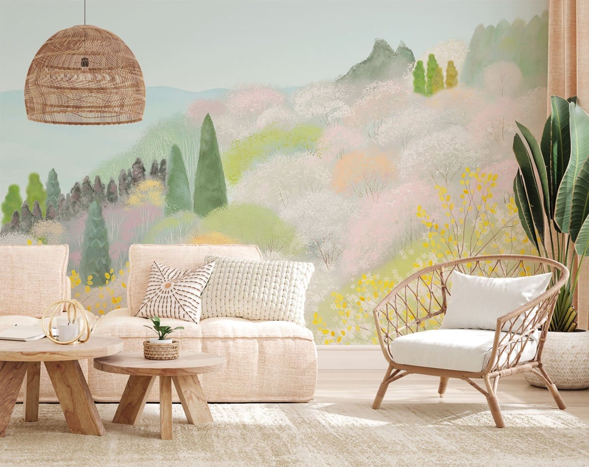 Embrace the serene allure of the Plum Blossom II Wallpaper Mural, where delicate blossoms and soft-edged trees evoke a tranquil pastoral scene. The harmonious blend of pastel hues and subtle textures invites a sense of calm sophistication, making it an exquisite feature for diverse interiors. The seamless craftsmanship encourages a seamless flow, enhancing its artistic nuance, suitable for those who appreciate nature's grace within their living spaces.