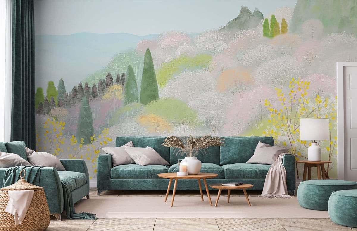 Upgrade the level of modernity to your home by owning one of the most wonderful paintings Mural wallpapers. The wallpaper will widen your Salon and impress your guest by how warm it is and how it adds Charming vibe to your house. These Plum trees with their pastel colours give a full feeling of charm and calmness. This landscape of a clear sky holding the trees in its arms will add the warmness to your walls. Compliment this master piece design with a simple, modern furniture style to complete the relaxing mood. The wallpaper mural is perfect for a salon, Kids鈥?room or a master bedroom. The design upscale the area and widen the place because of the light pastel colours in the used pallet. The design will also enrich your reading nook with more relaxing vibes for you to dive deep while you are enjoying your books.