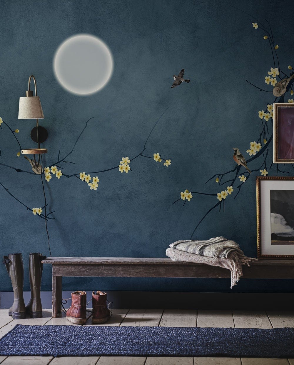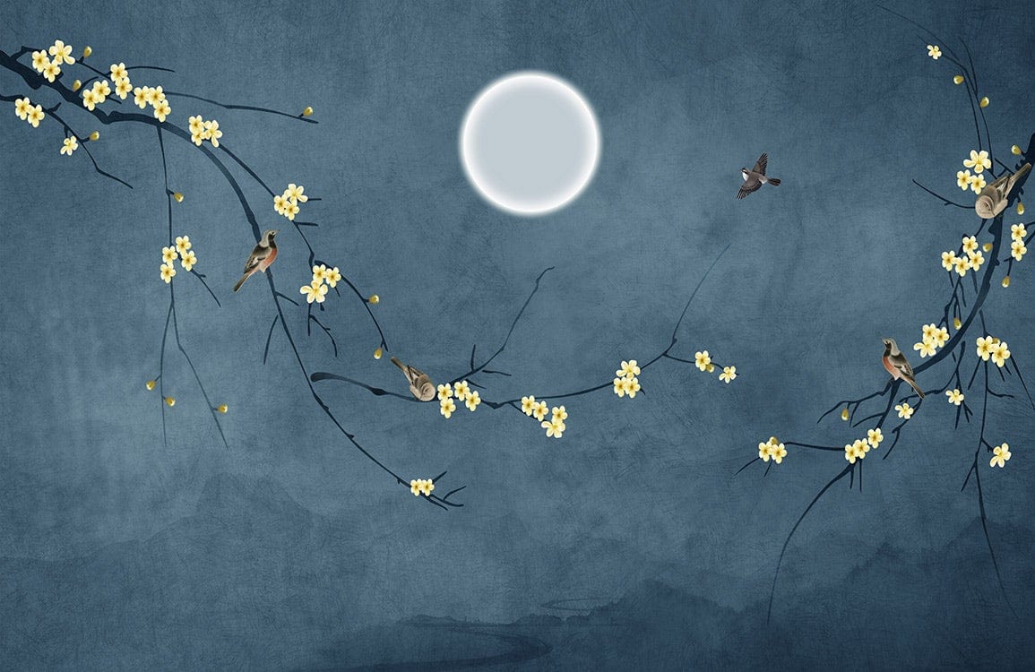 Examine the beauty of this mural wallpaper and feel the relaxing vibes that this one gives. The yellow blossoms with the birds standing on it provides freedom and a chilling mood. Especially the moon in the center of the wallpaper feels like real giving some light and positivity; besides, the main background of the picture provides relaxation and shows more the importance of the colours in the wallpaper. What's more, it conveys a vintage style. When adding simple light- coloured furniture, it will complete the spirit of the room and provide coziness. Warm your room and get the simplicity and happiness this mural wallpaper gives.