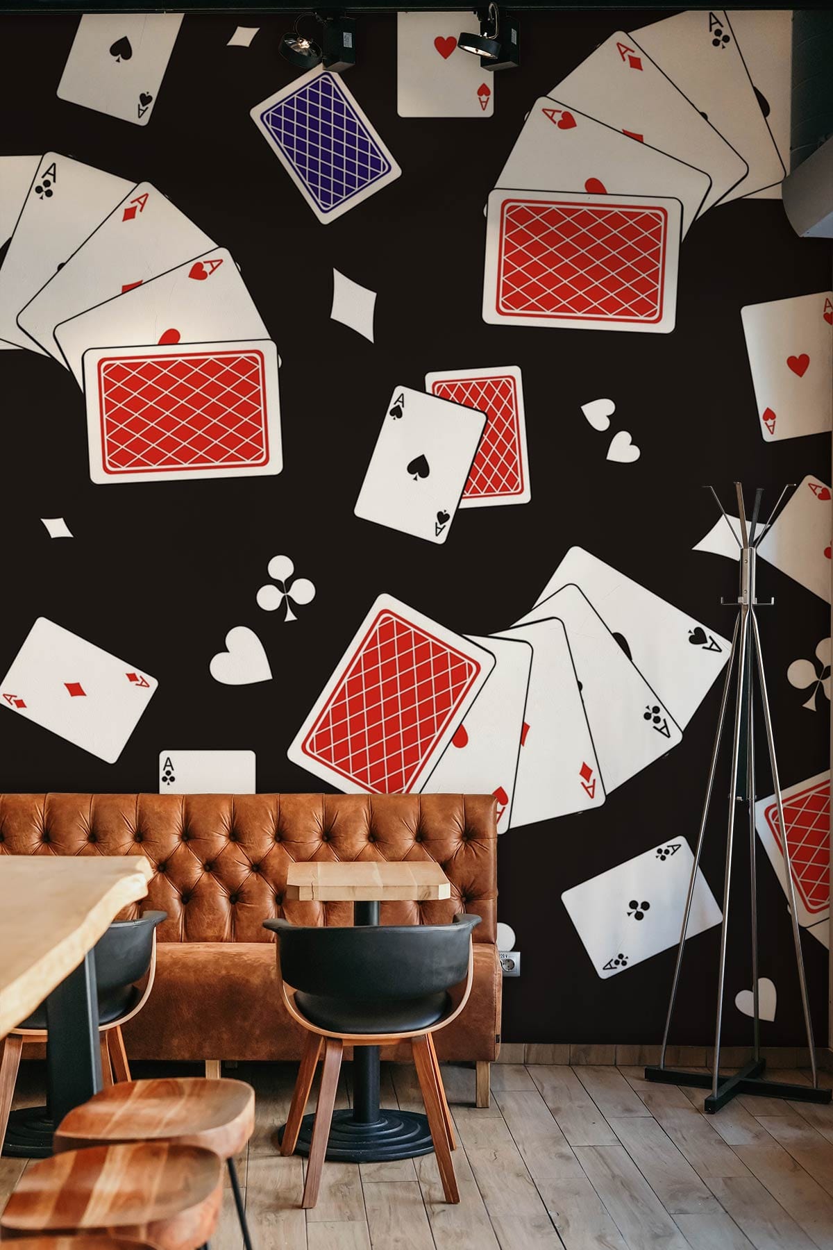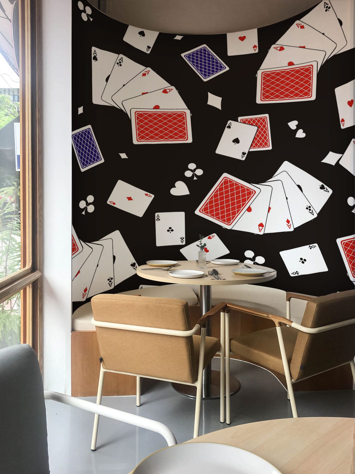 Introducing a sophisticated wall mural featuring a dynamic poker card motif that brings together a delightful contrast of vivid red and deep black. The intricate arrangement of scattered playing cards creates a lively yet elegant ambience, perfect for adding a touch of whimsy and class to any setting. This mural delicately balances bold design with a sense of timeless refinement, effortlessly fitting into both classic and contemporary interiors.
