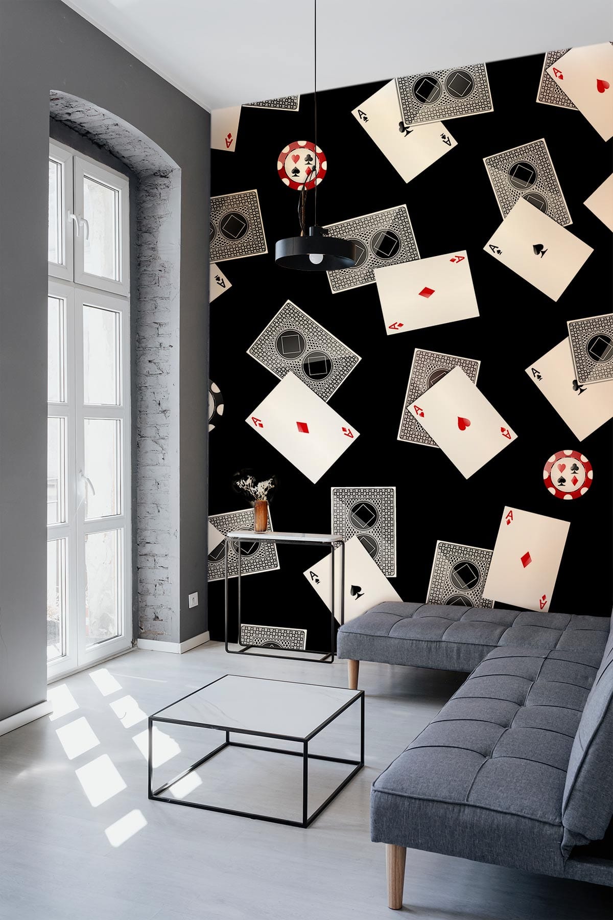 Dive into a world of sophistication with the Poker Dice Wallpaper Mural. Featuring an intricate dance of playing cards and poker chips set against a deep black canvas, this mural adds an element of intrigue and elegance to any space. Its detailed textures and strategic motifs offer a unique visual interest, appealing to those who appreciate both art and the thrill of the game. Suitable for various settings, it invites you to create an atmosphere of timeless style.