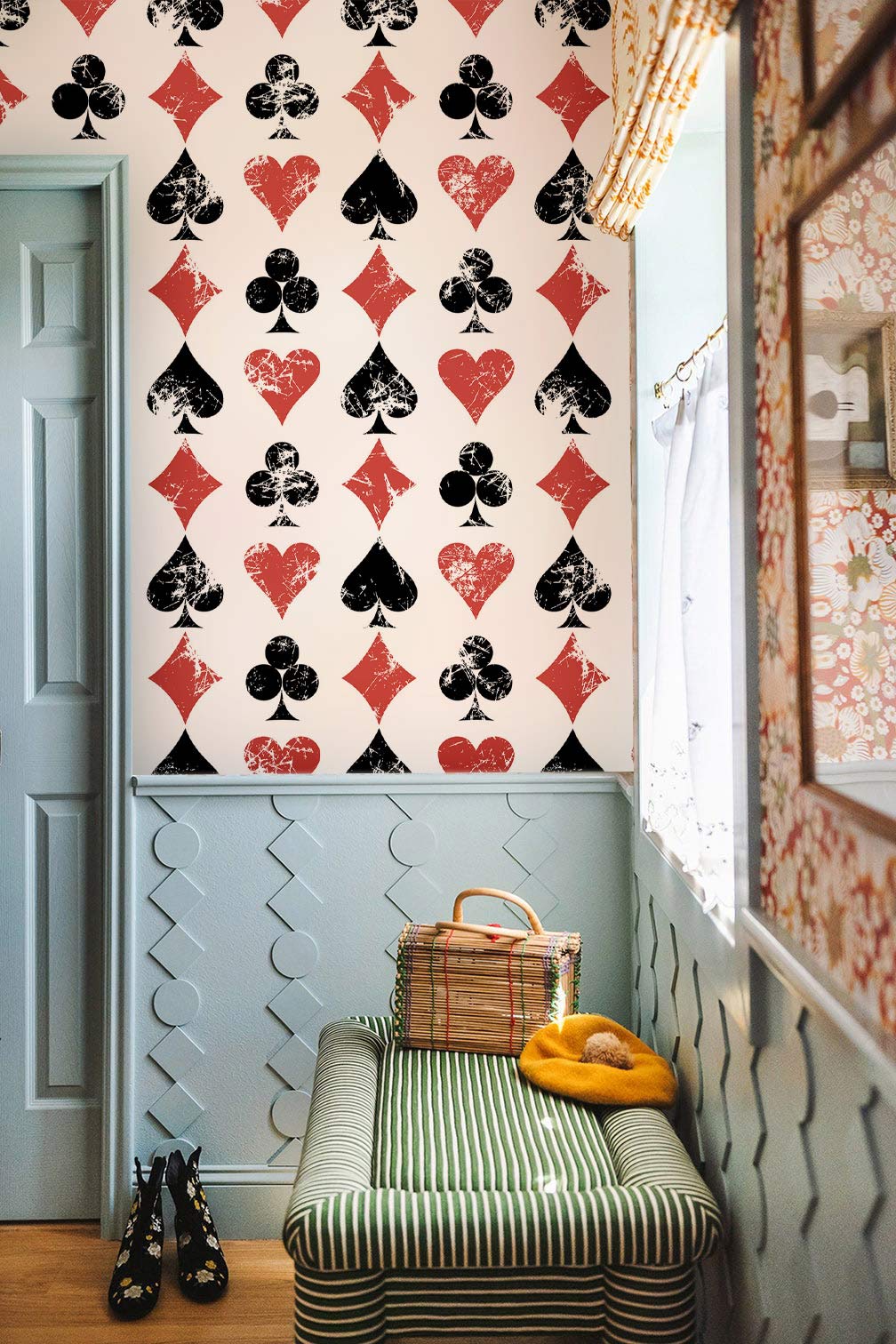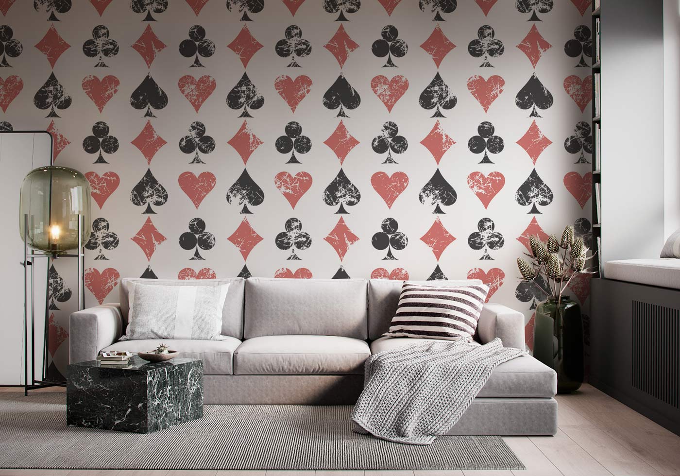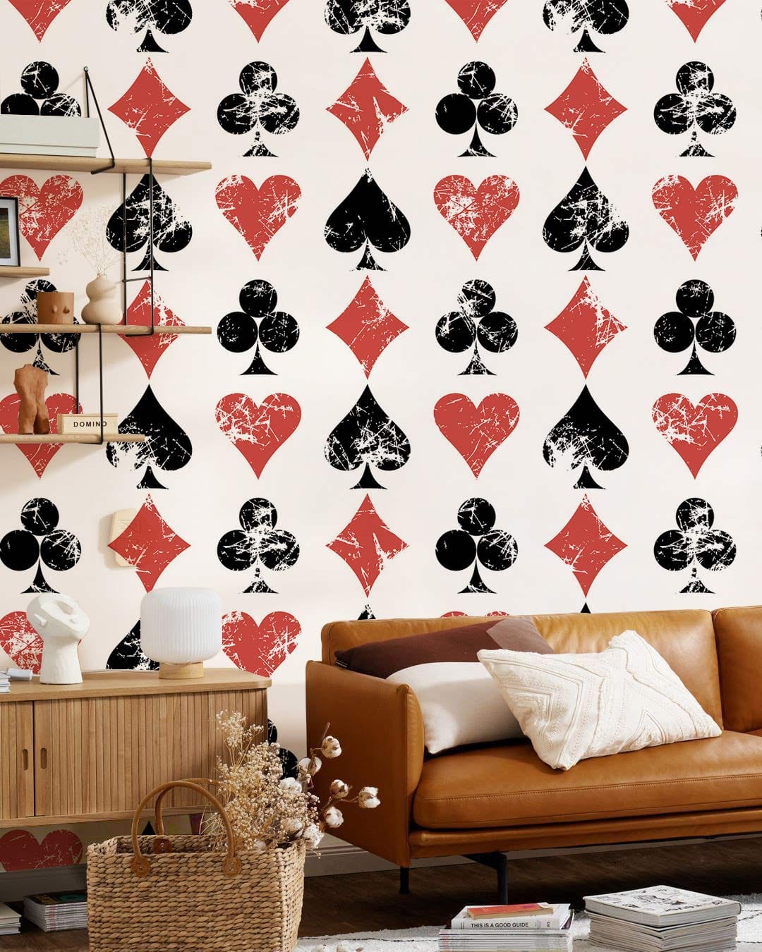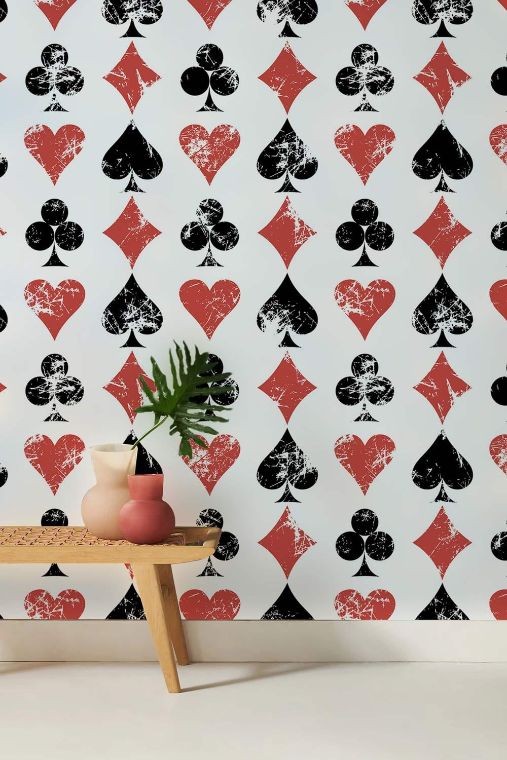 Dive into the world of classic sophistication with the Poker Pattern Wallpaper Mural. Featuring a harmonious blend of suits, the design captures the essence of timeless card games, offering an artistic texture to the walls. Its intricate motifs in rich hues are perfect for adding character to any room, creating a refined ambience with a nod to both playfulness and elegance.