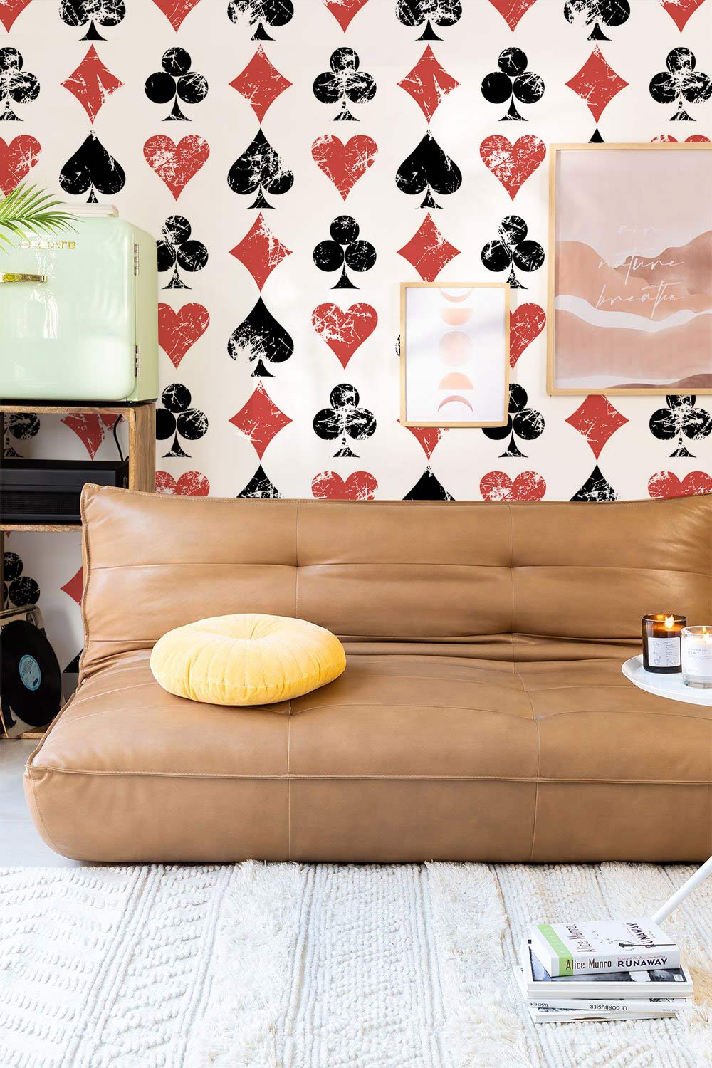 This casino-themed wallpaper mural is perfect for those who want a modern, sleek, and sophisticated design in their house. The mural features red and black heart, spades, flower, and diamond shapes, reminiscent of card games pattern, to bring the excitement of poker into your home. Whether you love poker or are looking for a fun way to decorate a gaming room, our Poker Pattern Wallpaper Mural is perfect for you. The geometric design is ideal for your children's bedroom as well as adults who like contemporary abstract art.