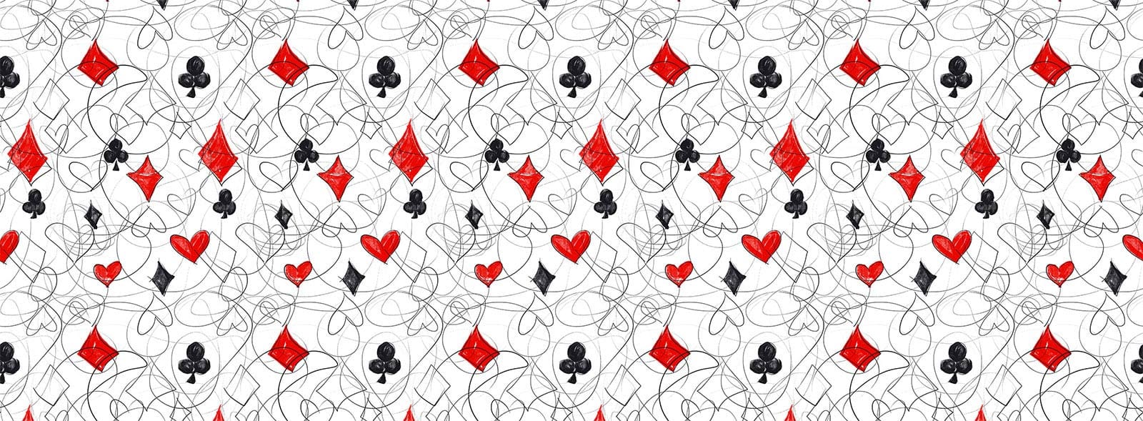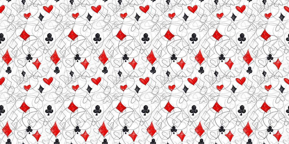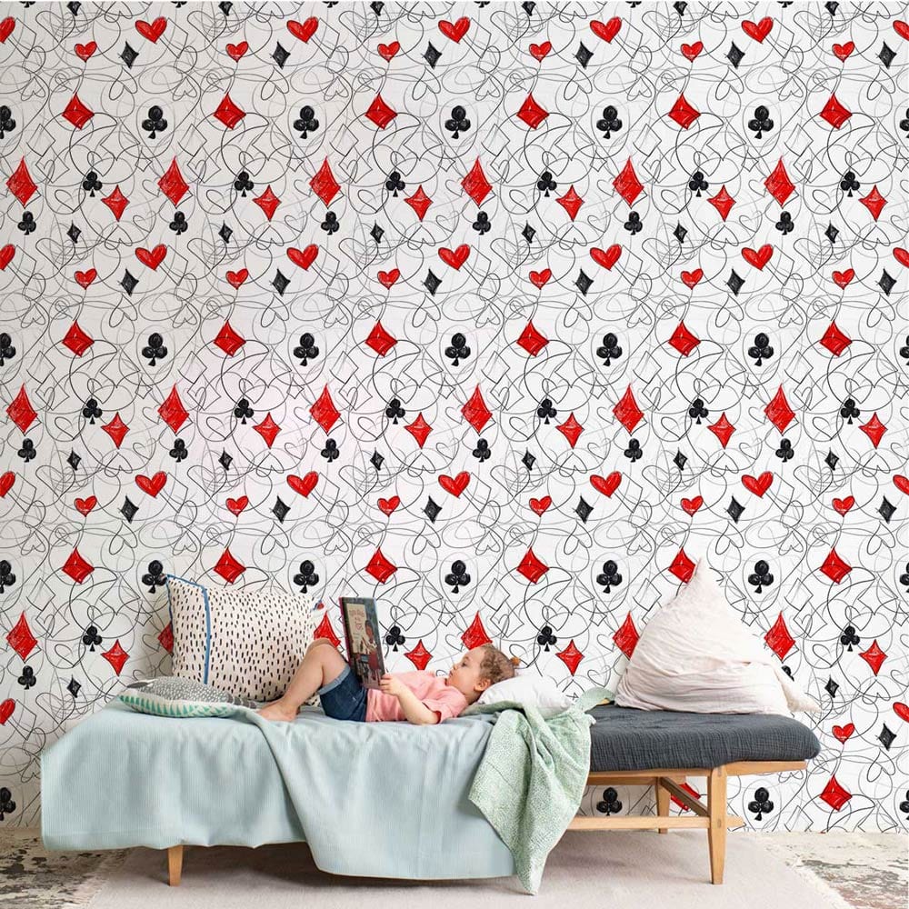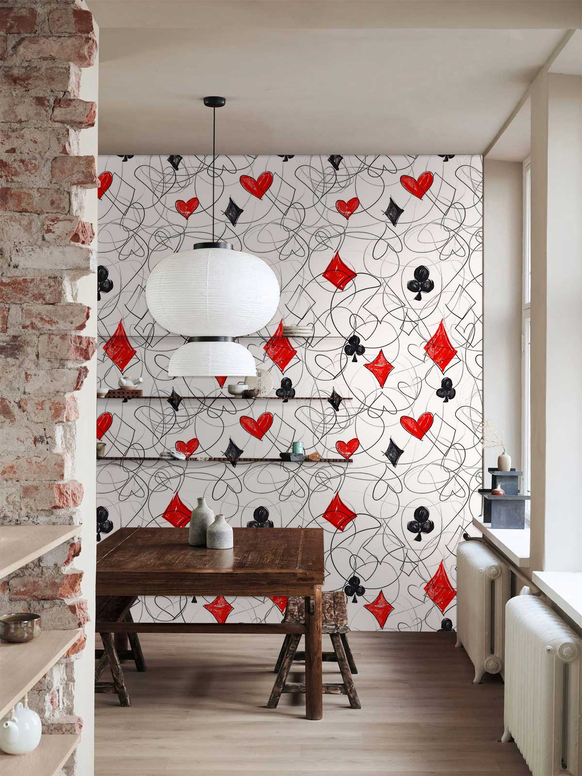 The Poker Threads Wallpaper Mural weaves a sophisticated tapestry of playing card motifs, capturing the essence of elegance with its intricate design. Red, black, and white hues twirl in rhythmic patterns, evoking the allure of a classic card game. This mural enhances any space with its timeless appeal, fitting seamlessly into both contemporary and traditional settings.
