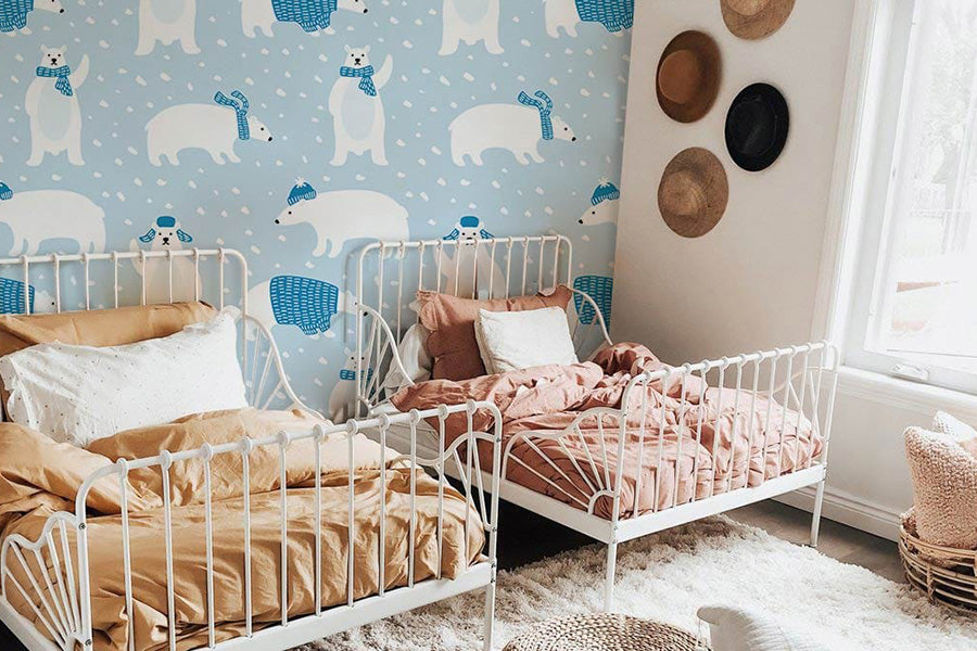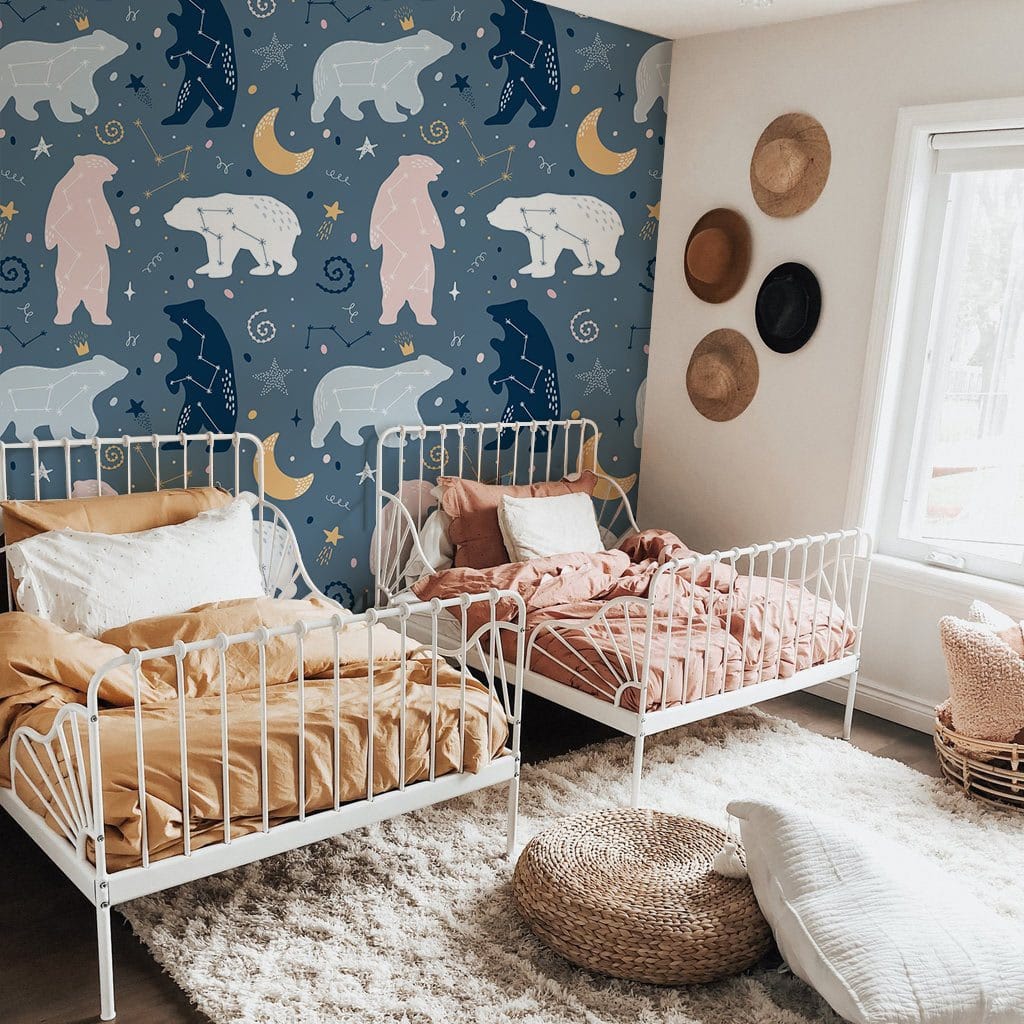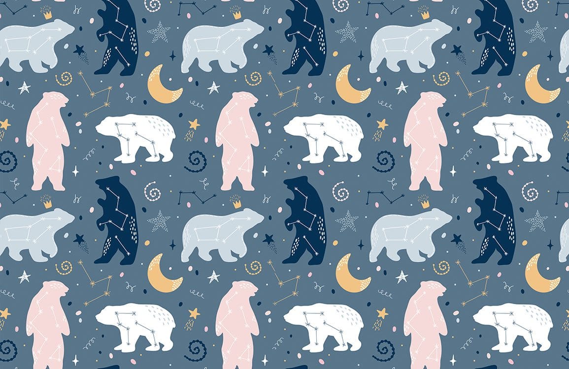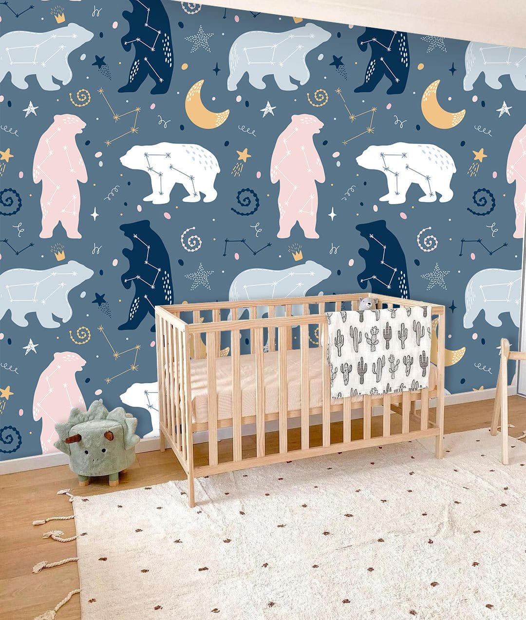 Bring a beautiful vibe to your space with this eye-catching polar bear wallpaper mural. The design creates various cute cartoon polar bear silhouette with constellation on their bodies, which will impress everyone who sees it. Use it as a feature wall in your bedroom or kids room and pair it with white or pastel colour furniture of your choice.