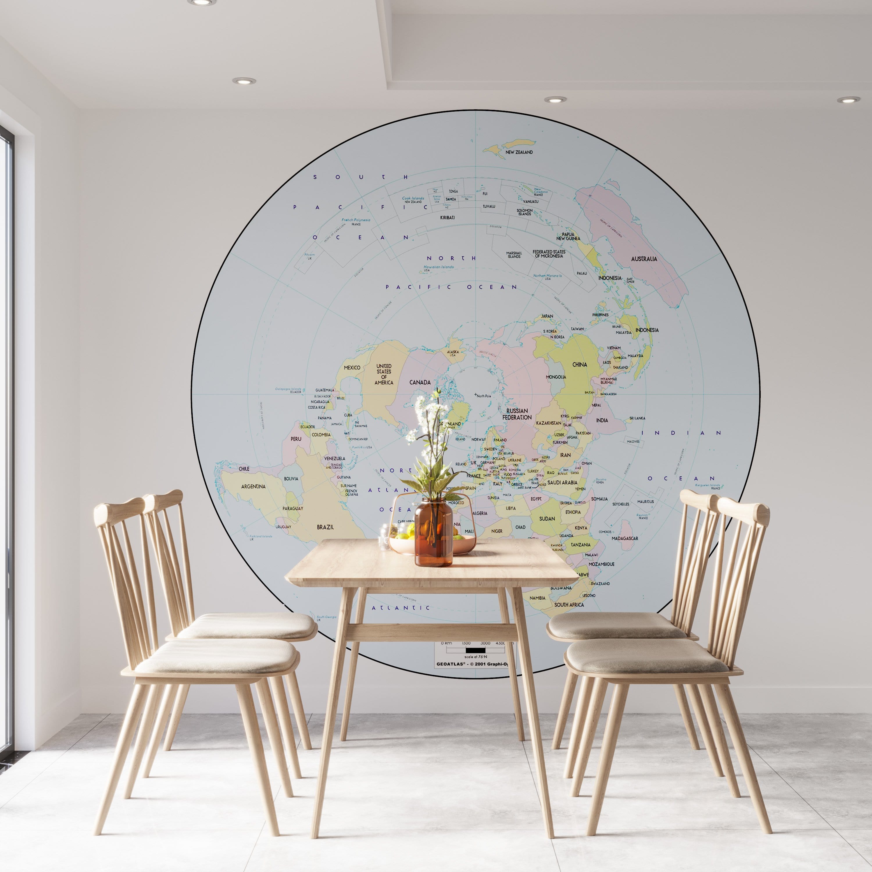 Immerse your space in the captivating presence of the Polar Projection Wallpaper Mural. Featuring an intricate world map design viewed from a unique polar perspective, this mural marries detailed cartographic elements with a palette of soothing pastels and rich earth tones. The cool blue oceans contrast elegantly with the warm hues of diverse continents, offering a calming yet intellectually stimulating backdrop. Ideal for spaces ranging from modern studies to classic living areas, this mural introduces both visual interest and a touch of worldly sophistication.