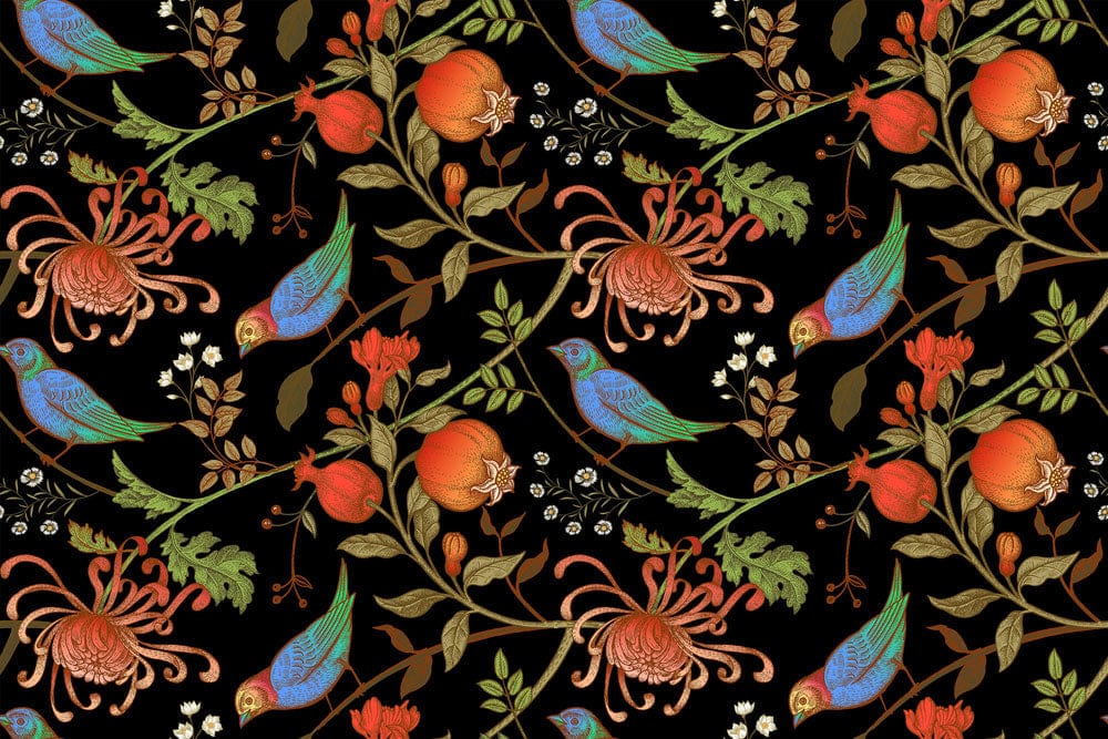 Immerse yourself in the lush, vibrant elegance of this Pomegranate Wallpaper Mural. The design features an intricate tapestry of colourful birds nestled among pomegranates and delicate blossoms. Its rich, deep backdrop accentuates the detailing, offering an artistic feast for the senses. The mural's timeless charm fits seamlessly into spaces wanting a hint of nature's splendour.