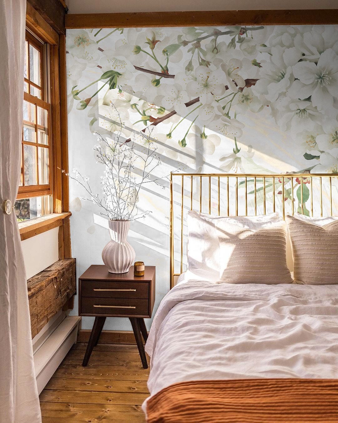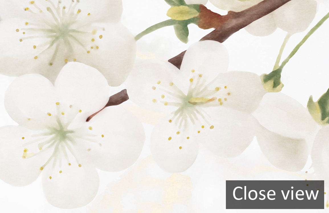 Experience the beautiful mural of pear blossoms with this handcrafted flower wallpaper mural. The delicate, pure pear blossoms on this white wall mural will add peace and simplicity to your interior design as it will remind you of the sweet springtime. So, give your room a touch of Asian elegance with our Pure Pear Blossoms Wallpaper Mural and create a romantic aesthetic ideal for your bedroom.