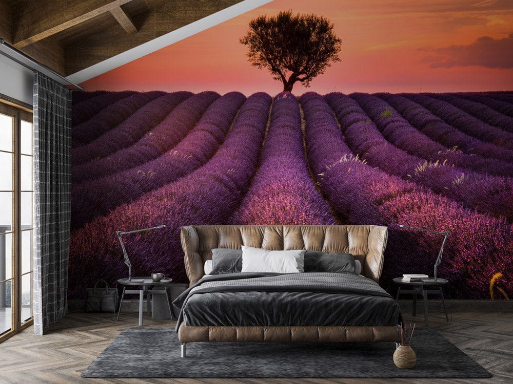 Immerse yourself in the serene beauty of the countryside with the Lavender Fields Wallpaper Mural. This exquisite design features endless waves of lush lavender under a radiant sunset sky, capturing the essence of nature's tranquillity. Each detail, from the delicate textures of the blooms to the soft, fading horizon, invites a sense of peace and luxury, making it a perfect backdrop for both traditional and contemporary settings.