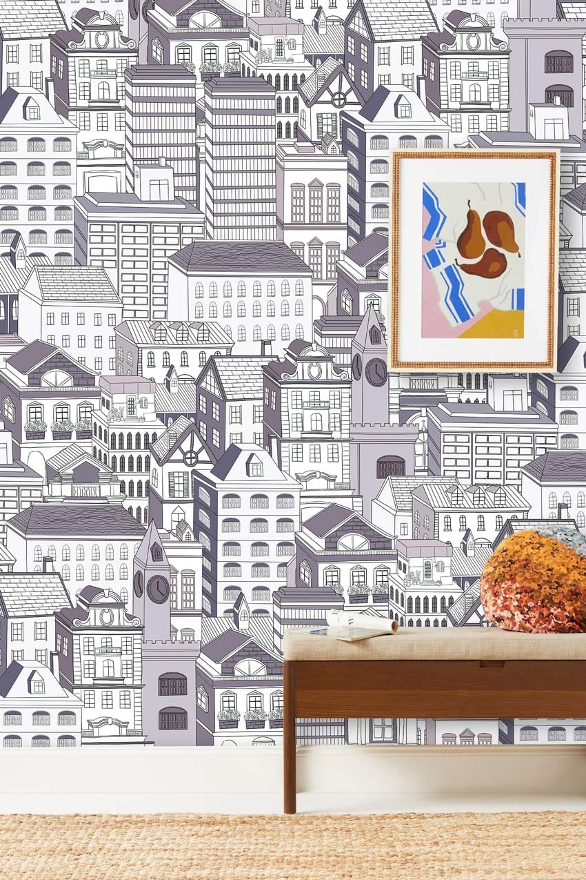 Bring a spectacular vibe to your space with this line drawing house and buildings portrait wallpaper mural. The artwork created in purple & white brings simplicity and modernlism to the design. Use it as a feature wall in your room with furniture of your choice as the white backdrops is perfect to pair with all home decoration.